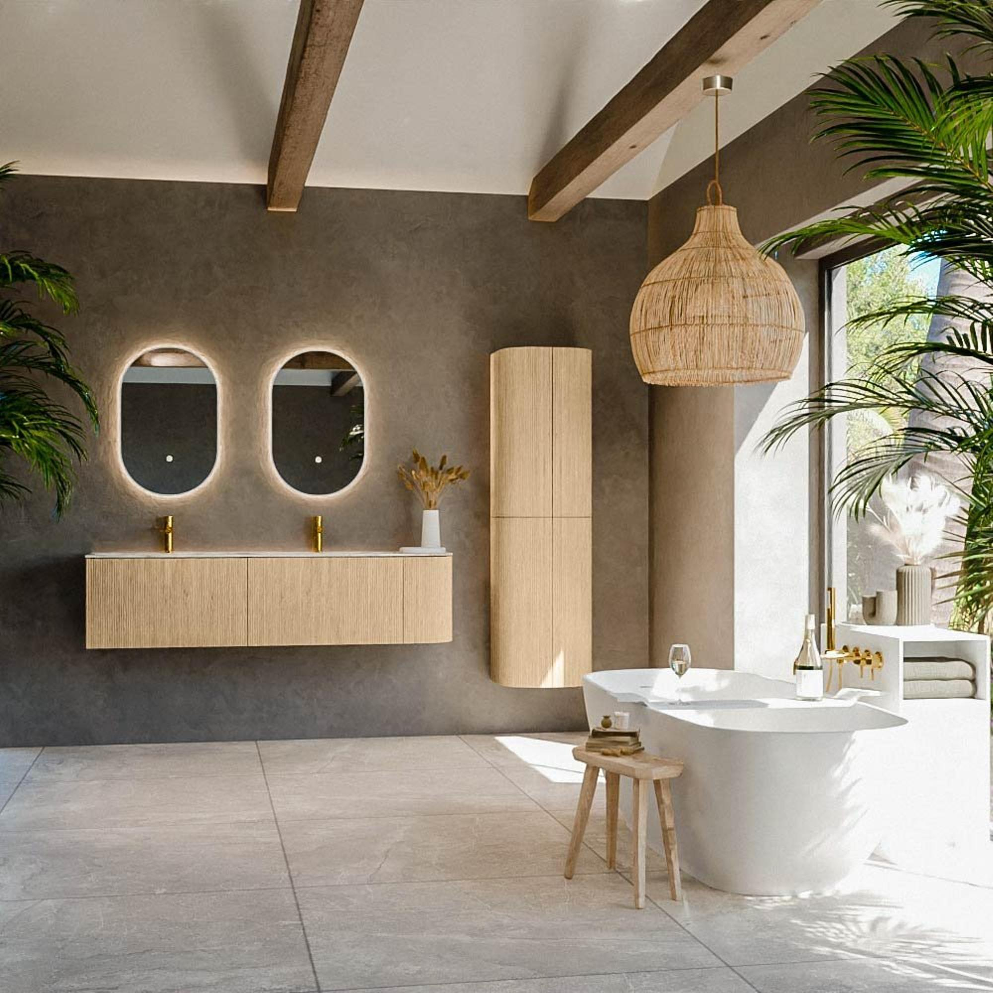 Het ultieme badmeubel dat je badkamer transformeert tot een oase van verfijning. Met zijn halfronde, verticale stroken van massief eiken, verkrijgbaar in de kleuren Oak en Walnut, straalt KURVE vakmanschap uit in elk detail. De zachte rondingen en slim ontworpen deurtjes, elk 40cm hoog, nodigen uit tot gebruik, terwijl de ruimte binnenin optimaal benut wordt dankzij de royale lade van dezelfde hoogte.