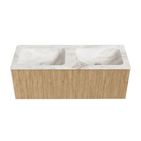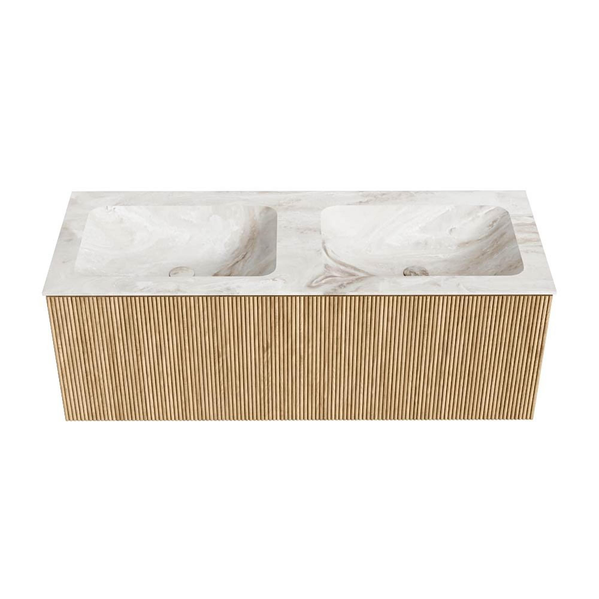 MONDIAZ KURVE-DLUX 120cm badmeubel kleur Oak met 1 lade. Wastafel LEAF dubbel zonder kraangat kleur Frappe.