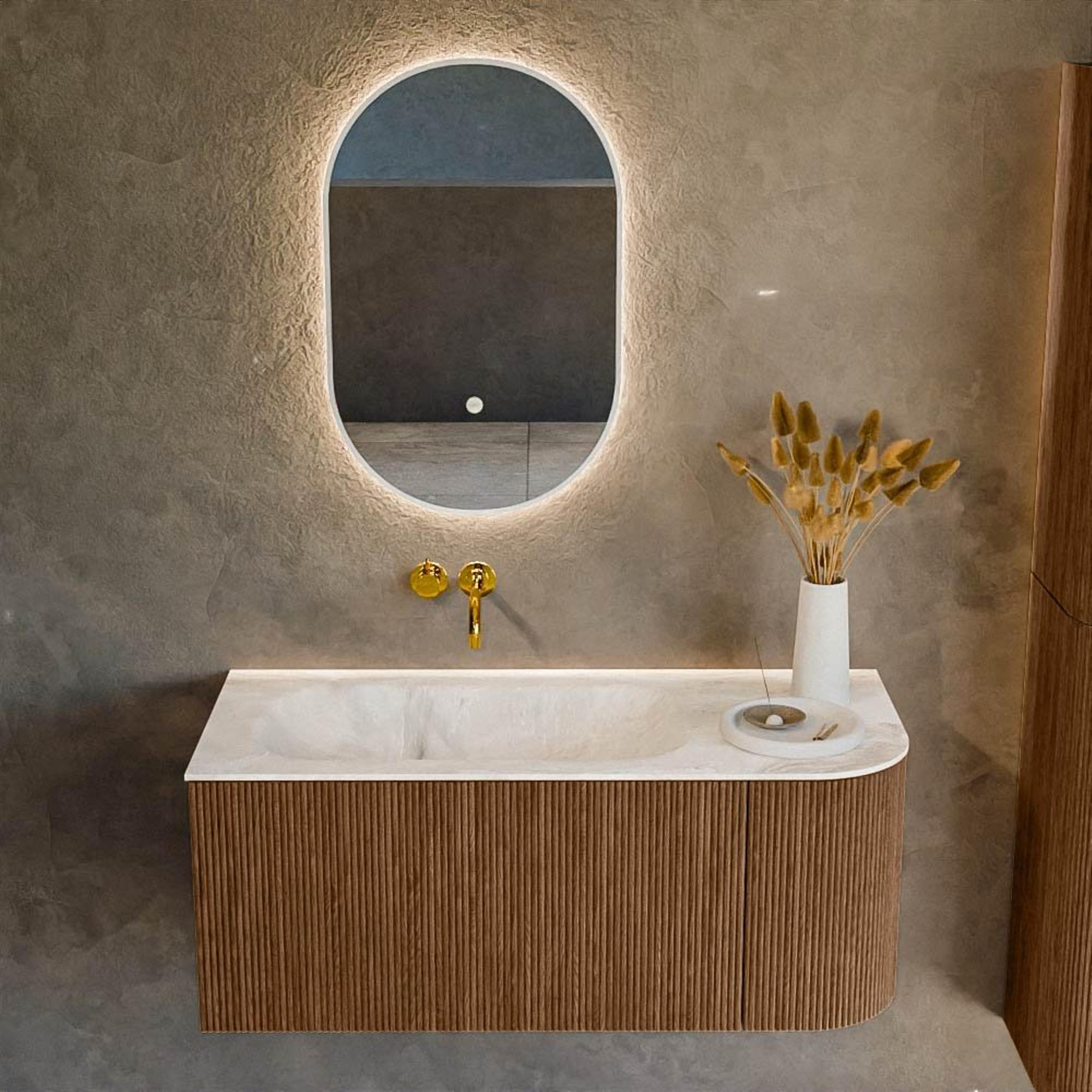 Het ultieme badmeubel dat je badkamer transformeert tot een oase van verfijning. Met zijn halfronde, verticale stroken van massief eiken, verkrijgbaar in de kleuren Oak en Walnut, straalt KURVE vakmanschap uit in elk detail. De zachte rondingen en slim ontworpen deurtjes, elk 40cm hoog, nodigen uit tot gebruik, terwijl de ruimte binnenin optimaal benut wordt dankzij de royale lade van dezelfde hoogte.