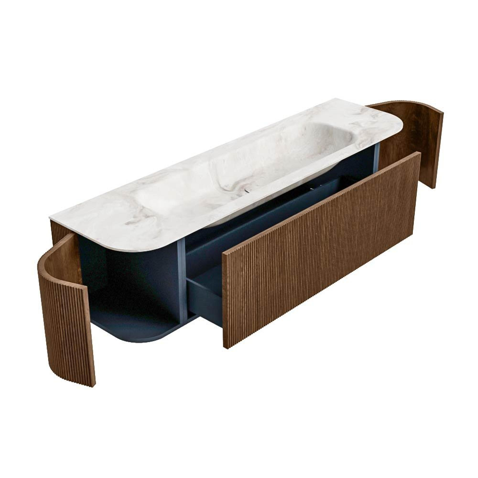 Het ultieme badmeubel dat je badkamer transformeert tot een oase van verfijning. Met zijn halfronde, verticale stroken van massief eiken, verkrijgbaar in de kleuren Oak en Walnut, straalt KURVE vakmanschap uit in elk detail. De zachte rondingen en slim ontworpen deurtjes, elk 40cm hoog, nodigen uit tot gebruik, terwijl de ruimte binnenin optimaal benut wordt dankzij de royale lade van dezelfde hoogte.