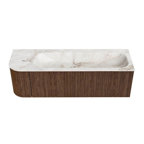 Het ultieme badmeubel dat je badkamer transformeert tot een oase van verfijning. Met zijn halfronde, verticale stroken van massief eiken, verkrijgbaar in de kleuren Oak en Walnut, straalt KURVE vakmanschap uit in elk detail. De zachte rondingen en slim ontworpen deurtjes, elk 40cm hoog, nodigen uit tot gebruik, terwijl de ruimte binnenin optimaal benut wordt dankzij de royale lade van dezelfde hoogte.
