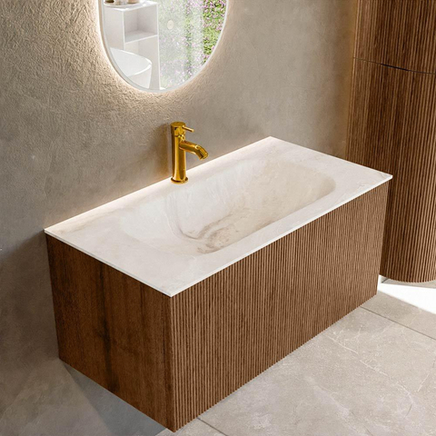 MONDIAZ KURVE-DLUX 90cm badmeubel kleur Walnut met 1 lade. Wastafel BIG SMALL midden 1 kraangat kleur Frappe.