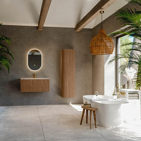 Het ultieme badmeubel dat je badkamer transformeert tot een oase van verfijning. Met zijn halfronde, verticale stroken van massief eiken, verkrijgbaar in de kleuren Oak en Walnut, straalt KURVE vakmanschap uit in elk detail. De zachte rondingen en slim ontworpen deurtjes, elk 40cm hoog, nodigen uit tot gebruik, terwijl de ruimte binnenin optimaal benut wordt dankzij de royale lade van dezelfde hoogte.