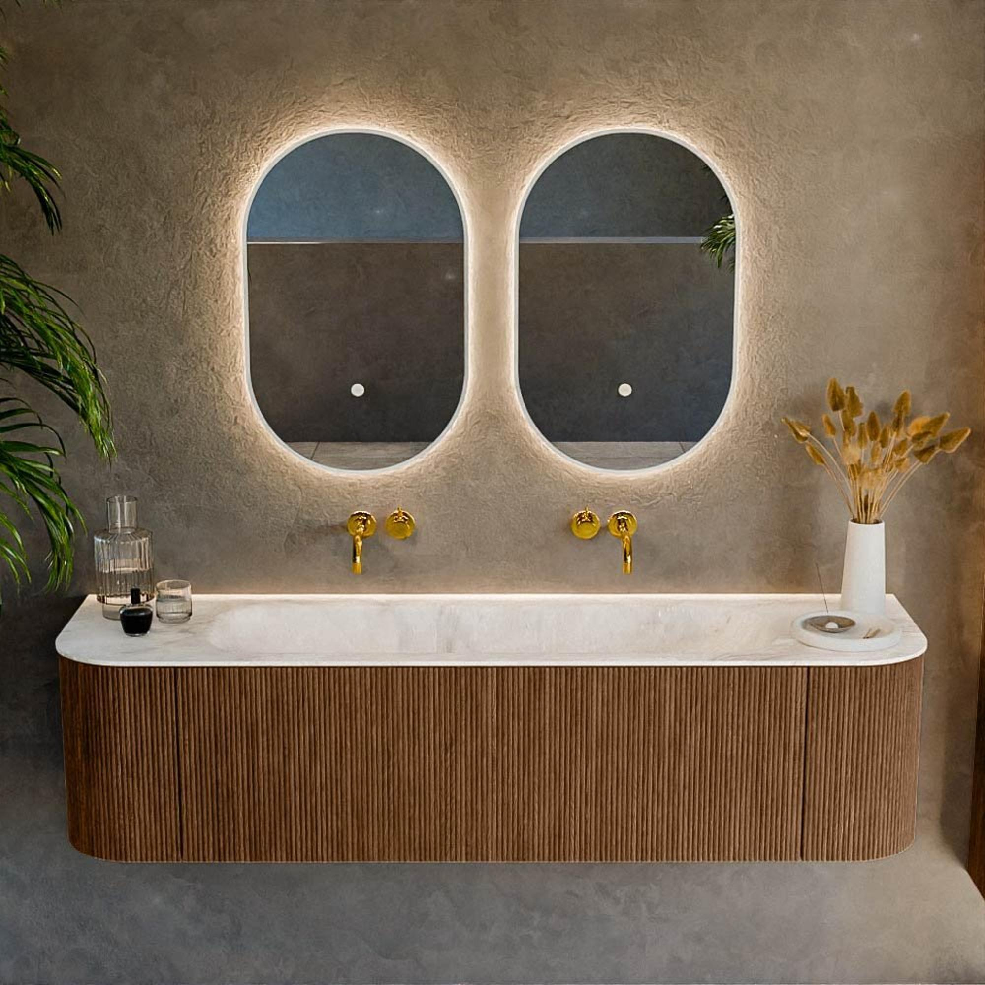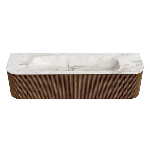 Het ultieme badmeubel dat je badkamer transformeert tot een oase van verfijning. Met zijn halfronde, verticale stroken van massief eiken, verkrijgbaar in de kleuren Oak en Walnut, straalt KURVE vakmanschap uit in elk detail. De zachte rondingen en slim ontworpen deurtjes, elk 40cm hoog, nodigen uit tot gebruik, terwijl de ruimte binnenin optimaal benut wordt dankzij de royale lade van dezelfde hoogte.