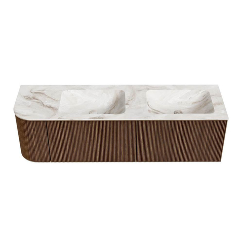 MONDIAZ KURVE-DLUX 155cm badmeubel met module 25 L kleur Walnut met 2 lades en 1 deur. Wastafel LEAF dubbel / rechts zonder kraangat kleur Frappe.