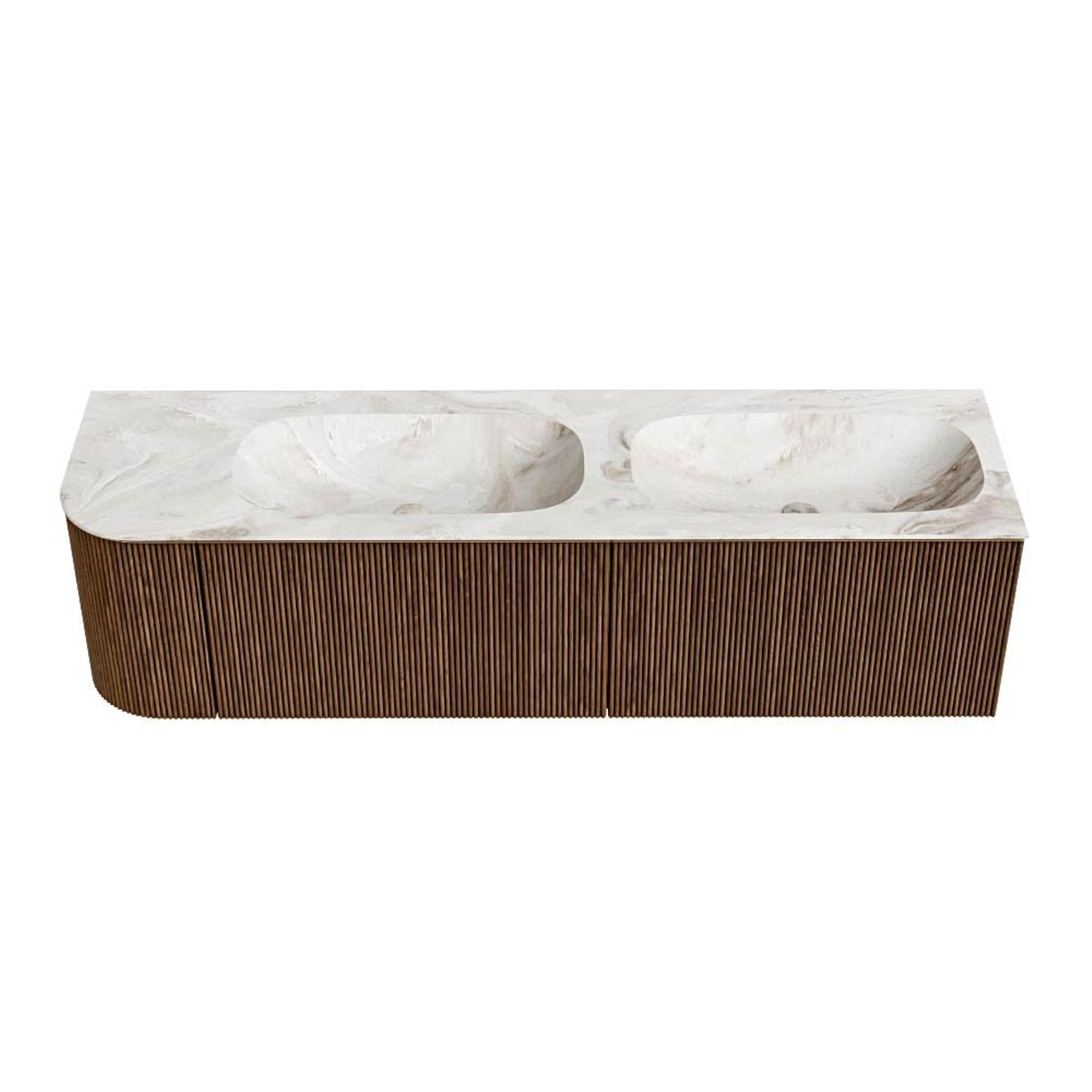 MONDIAZ KURVE-DLUX 165cm badmeubel met module 25 L kleur Walnut met 2 lades en 1 deur. Wastafel STOR SMALL dubbel / rechts zonder kraangat kleur Frappe.