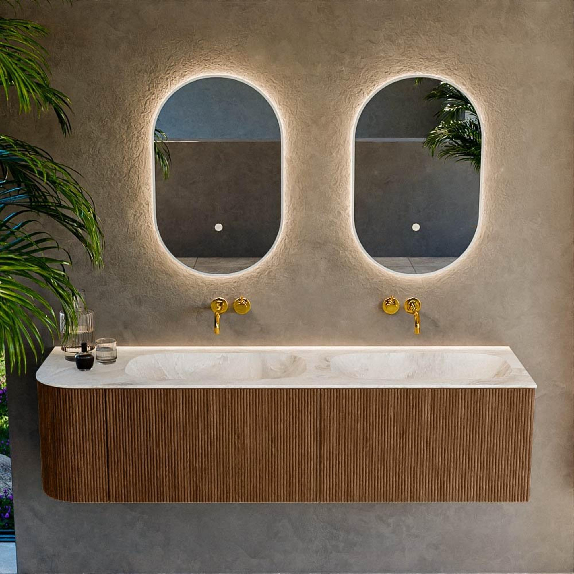 Het ultieme badmeubel dat je badkamer transformeert tot een oase van verfijning. Met zijn halfronde, verticale stroken van massief eiken, verkrijgbaar in de kleuren Oak en Walnut, straalt KURVE vakmanschap uit in elk detail. De zachte rondingen en slim ontworpen deurtjes, elk 40cm hoog, nodigen uit tot gebruik, terwijl de ruimte binnenin optimaal benut wordt dankzij de royale lade van dezelfde hoogte.