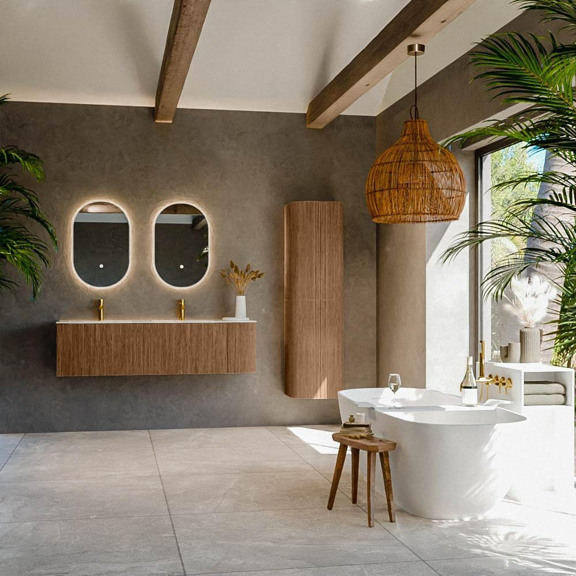 Het ultieme badmeubel dat je badkamer transformeert tot een oase van verfijning. Met zijn halfronde, verticale stroken van massief eiken, verkrijgbaar in de kleuren Oak en Walnut, straalt KURVE vakmanschap uit in elk detail. De zachte rondingen en slim ontworpen deurtjes, elk 40cm hoog, nodigen uit tot gebruik, terwijl de ruimte binnenin optimaal benut wordt dankzij de royale lade van dezelfde hoogte.