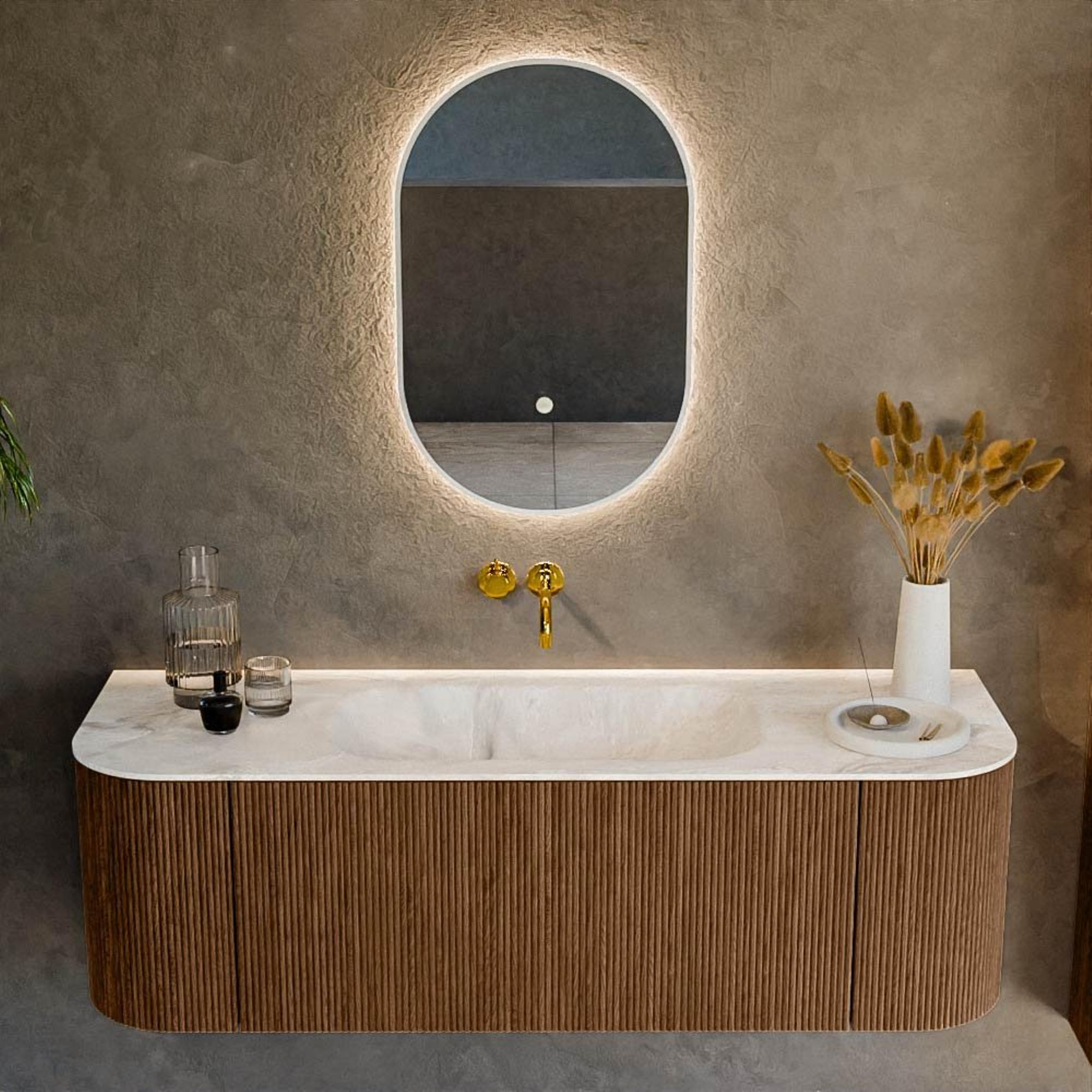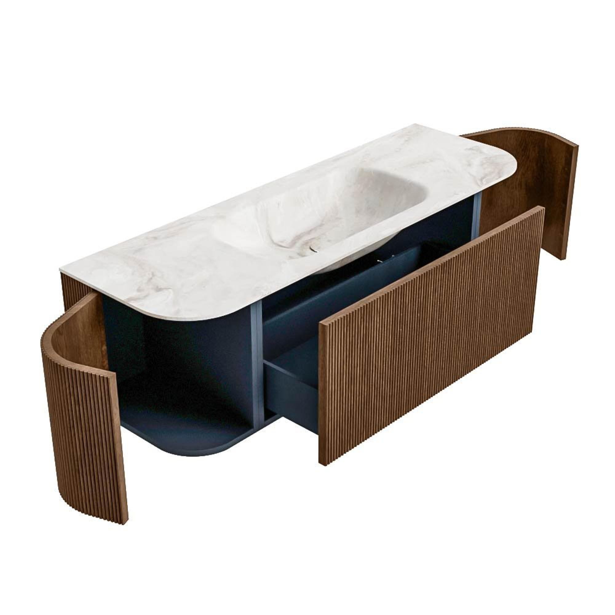 Het ultieme badmeubel dat je badkamer transformeert tot een oase van verfijning. Met zijn halfronde, verticale stroken van massief eiken, verkrijgbaar in de kleuren Oak en Walnut, straalt KURVE vakmanschap uit in elk detail. De zachte rondingen en slim ontworpen deurtjes, elk 40cm hoog, nodigen uit tot gebruik, terwijl de ruimte binnenin optimaal benut wordt dankzij de royale lade van dezelfde hoogte.