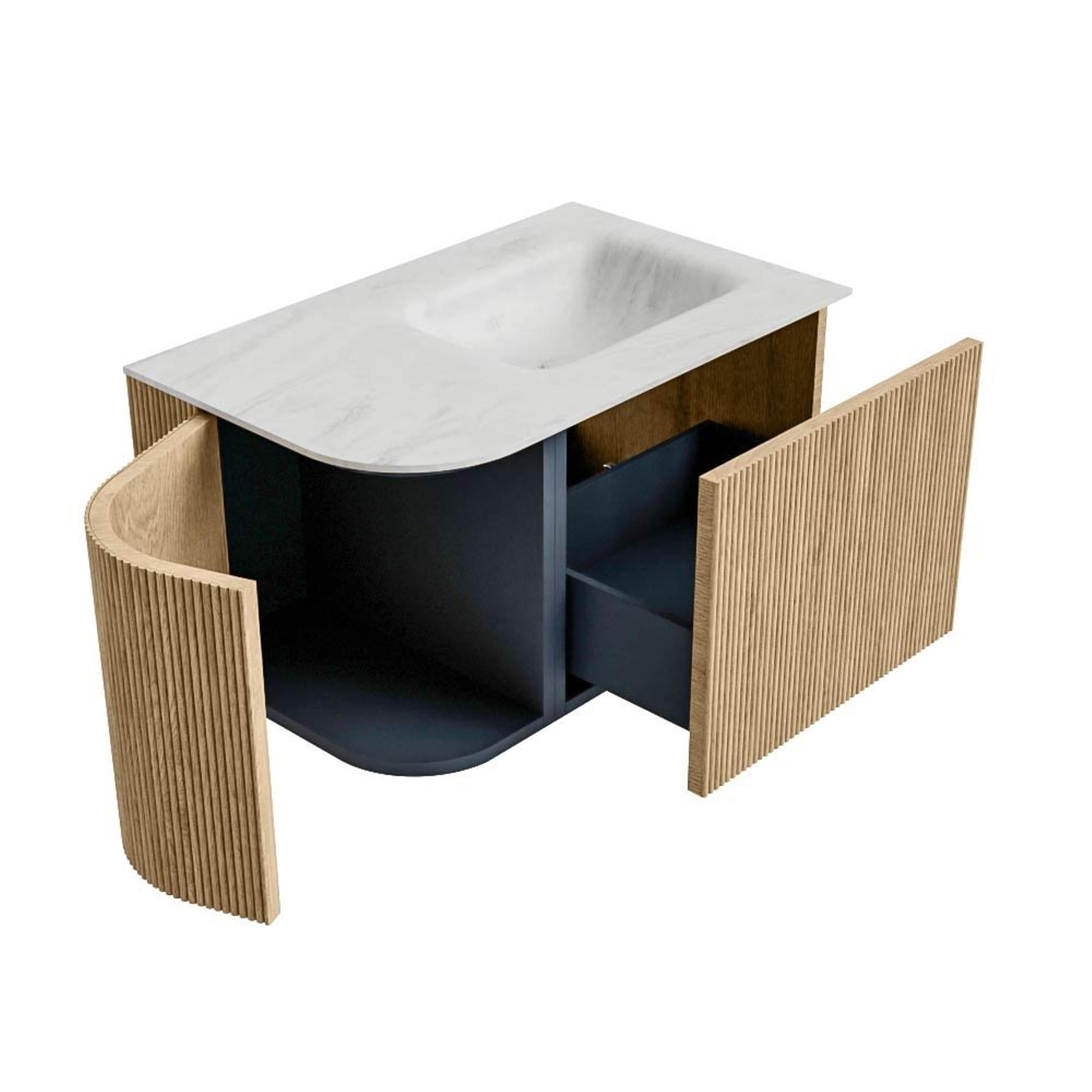 Het ultieme badmeubel dat je badkamer transformeert tot een oase van verfijning. Met zijn halfronde, verticale stroken van massief eiken, verkrijgbaar in de kleuren Oak en Walnut, straalt KURVE vakmanschap uit in elk detail. De zachte rondingen en slim ontworpen deurtjes, elk 40cm hoog, nodigen uit tot gebruik, terwijl de ruimte binnenin optimaal benut wordt dankzij de royale lade van dezelfde hoogte.