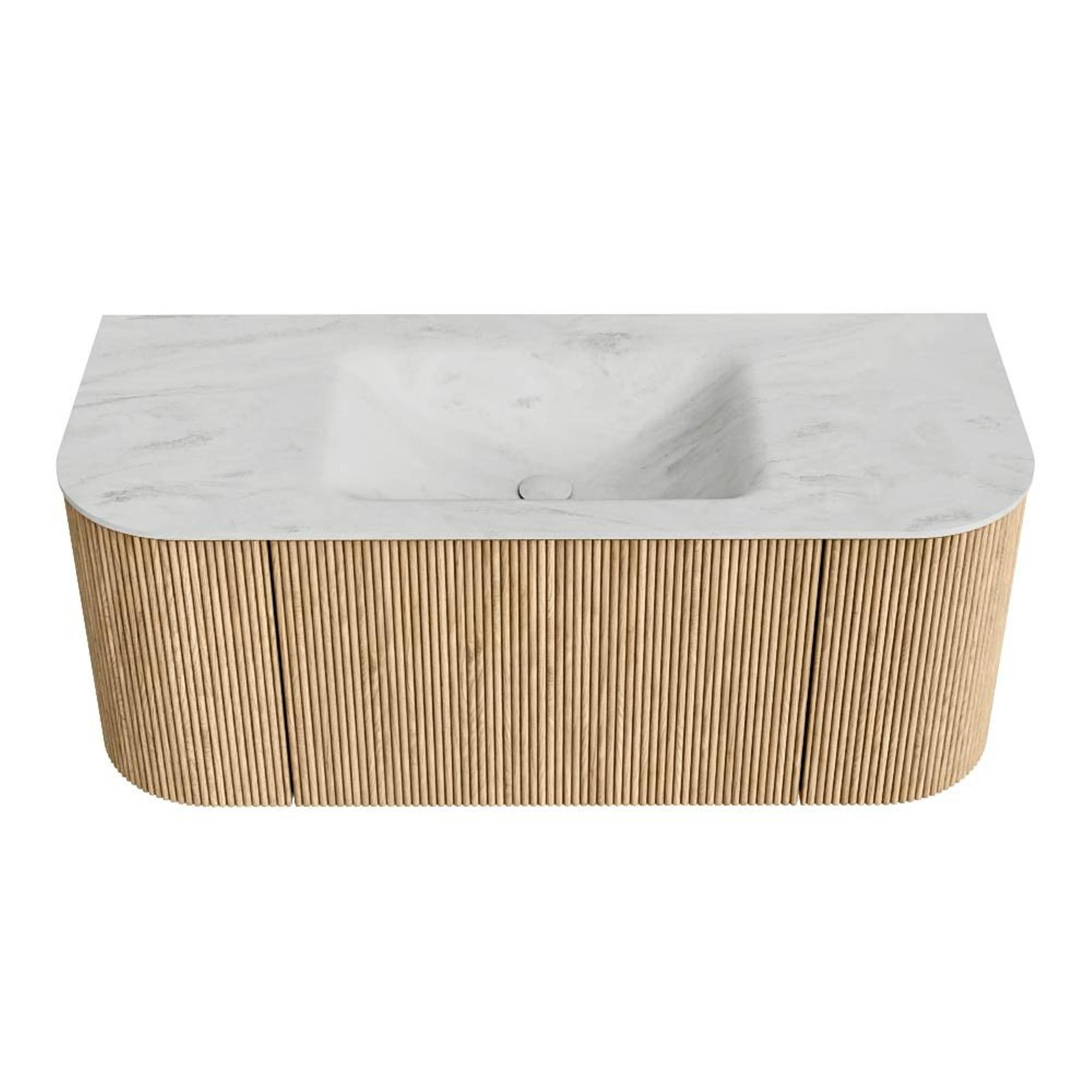 Het ultieme badmeubel dat je badkamer transformeert tot een oase van verfijning. Met zijn halfronde, verticale stroken van massief eiken, verkrijgbaar in de kleuren Oak en Walnut, straalt KURVE vakmanschap uit in elk detail. De zachte rondingen en slim ontworpen deurtjes, elk 40cm hoog, nodigen uit tot gebruik, terwijl de ruimte binnenin optimaal benut wordt dankzij de royale lade van dezelfde hoogte.