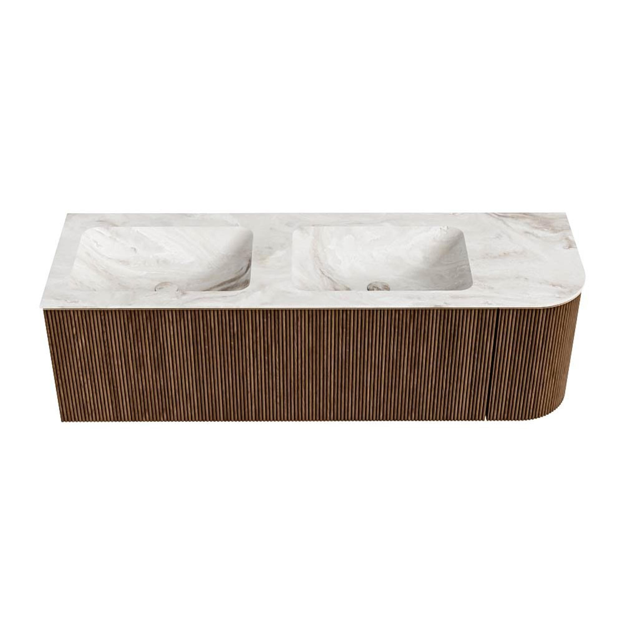 MONDIAZ KURVE-DLUX 145cm badmeubel met module 25 R kleur Walnut met 1 lade en 1 deur. Wastafel LEAF dubbel / links 2 kraangaten kleur Frappe.