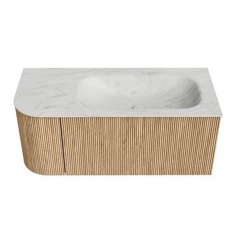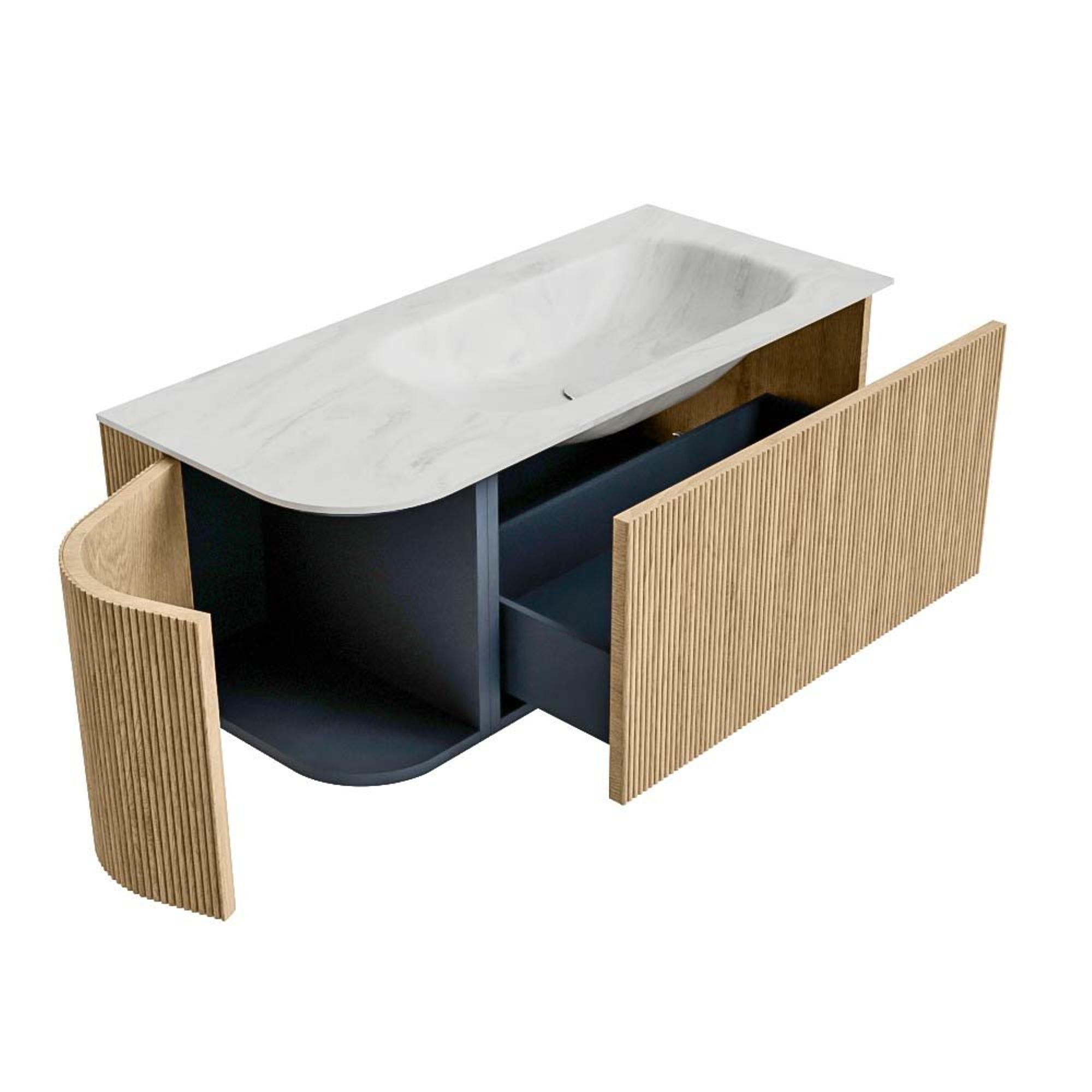 Het ultieme badmeubel dat je badkamer transformeert tot een oase van verfijning. Met zijn halfronde, verticale stroken van massief eiken, verkrijgbaar in de kleuren Oak en Walnut, straalt KURVE vakmanschap uit in elk detail. De zachte rondingen en slim ontworpen deurtjes, elk 40cm hoog, nodigen uit tot gebruik, terwijl de ruimte binnenin optimaal benut wordt dankzij de royale lade van dezelfde hoogte.