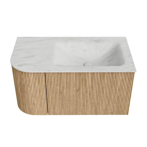 MONDIAZ KURVE-DLUX 85cm badmeubel met module 25 L kleur Oak met 1 lade en 1 deur. Wastafel CLOUD rechts zonder kraangat kleur Opalo.