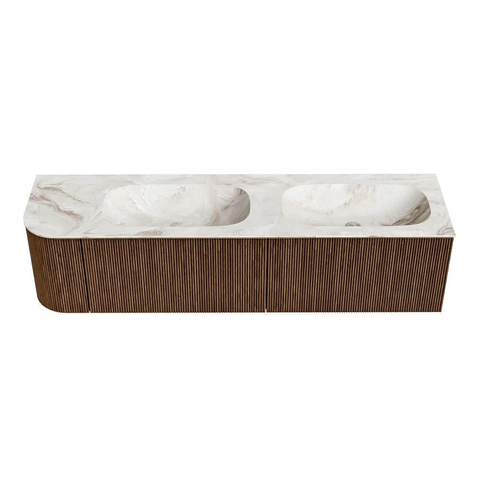 Het ultieme badmeubel dat je badkamer transformeert tot een oase van verfijning. Met zijn halfronde, verticale stroken van massief eiken, verkrijgbaar in de kleuren Oak en Walnut, straalt KURVE vakmanschap uit in elk detail. De zachte rondingen en slim ontworpen deurtjes, elk 40cm hoog, nodigen uit tot gebruik, terwijl de ruimte binnenin optimaal benut wordt dankzij de royale lade van dezelfde hoogte.