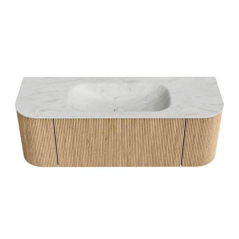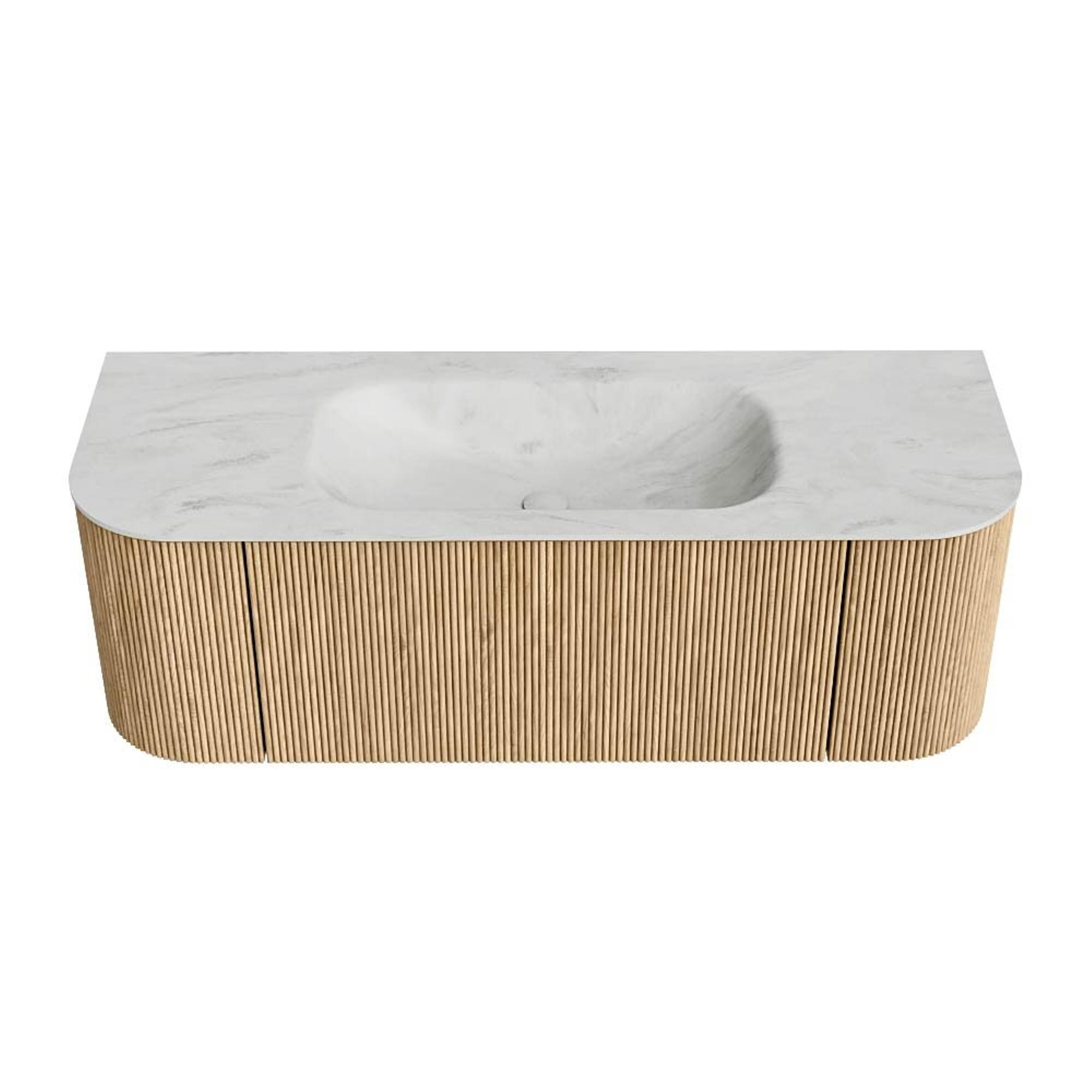 MONDIAZ KURVE-DLUX 130cm badmeubel met module 25 Len R kleur Oak met 1 lade en 2 deuren. Wastafel BIG SMALL midden zonder kraangat kleur Opalo.