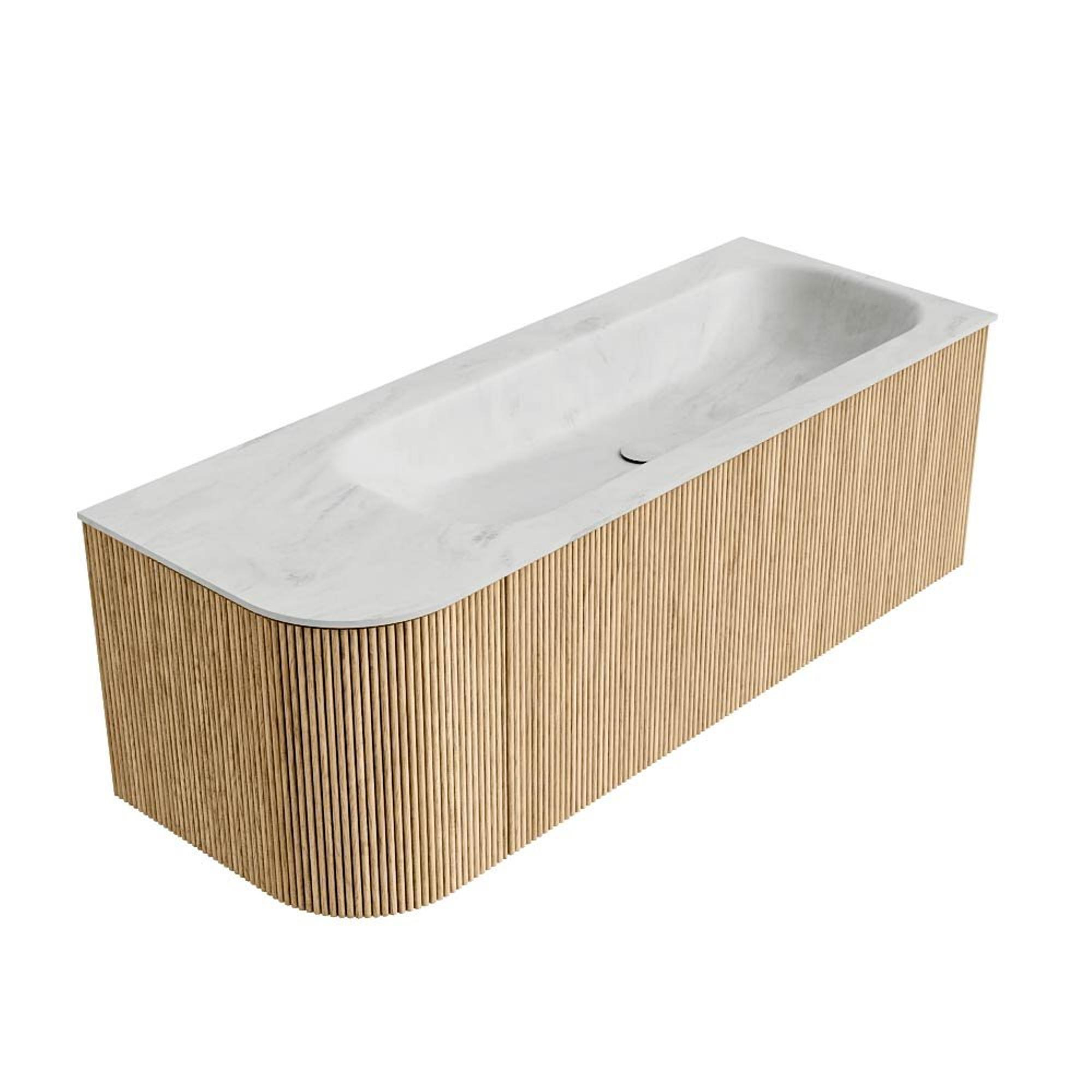 Het ultieme badmeubel dat je badkamer transformeert tot een oase van verfijning. Met zijn halfronde, verticale stroken van massief eiken, verkrijgbaar in de kleuren Oak en Walnut, straalt KURVE vakmanschap uit in elk detail. De zachte rondingen en slim ontworpen deurtjes, elk 40cm hoog, nodigen uit tot gebruik, terwijl de ruimte binnenin optimaal benut wordt dankzij de royale lade van dezelfde hoogte.