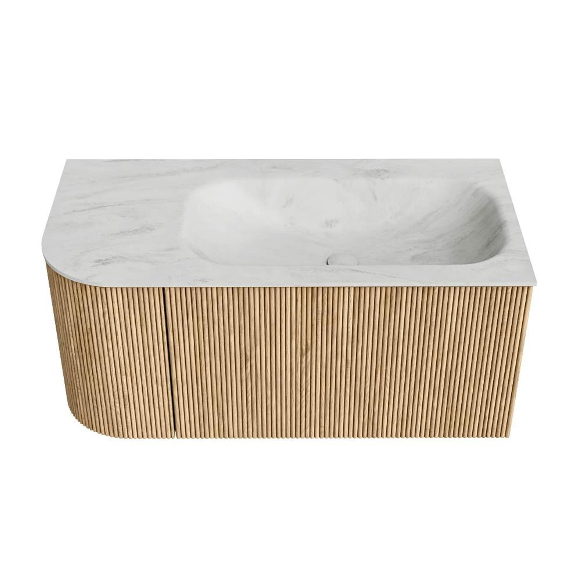 MONDIAZ KURVE-DLUX 95cm badmeubel met module 25 L kleur Oak met 1 lade en 1 deur. Wastafel BIG SMALL rechts zonder kraangat kleur Opalo.