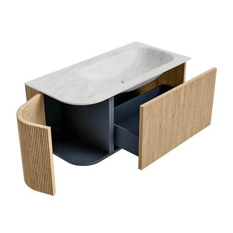 Het ultieme badmeubel dat je badkamer transformeert tot een oase van verfijning. Met zijn halfronde, verticale stroken van massief eiken, verkrijgbaar in de kleuren Oak en Walnut, straalt KURVE vakmanschap uit in elk detail. De zachte rondingen en slim ontworpen deurtjes, elk 40cm hoog, nodigen uit tot gebruik, terwijl de ruimte binnenin optimaal benut wordt dankzij de royale lade van dezelfde hoogte.
