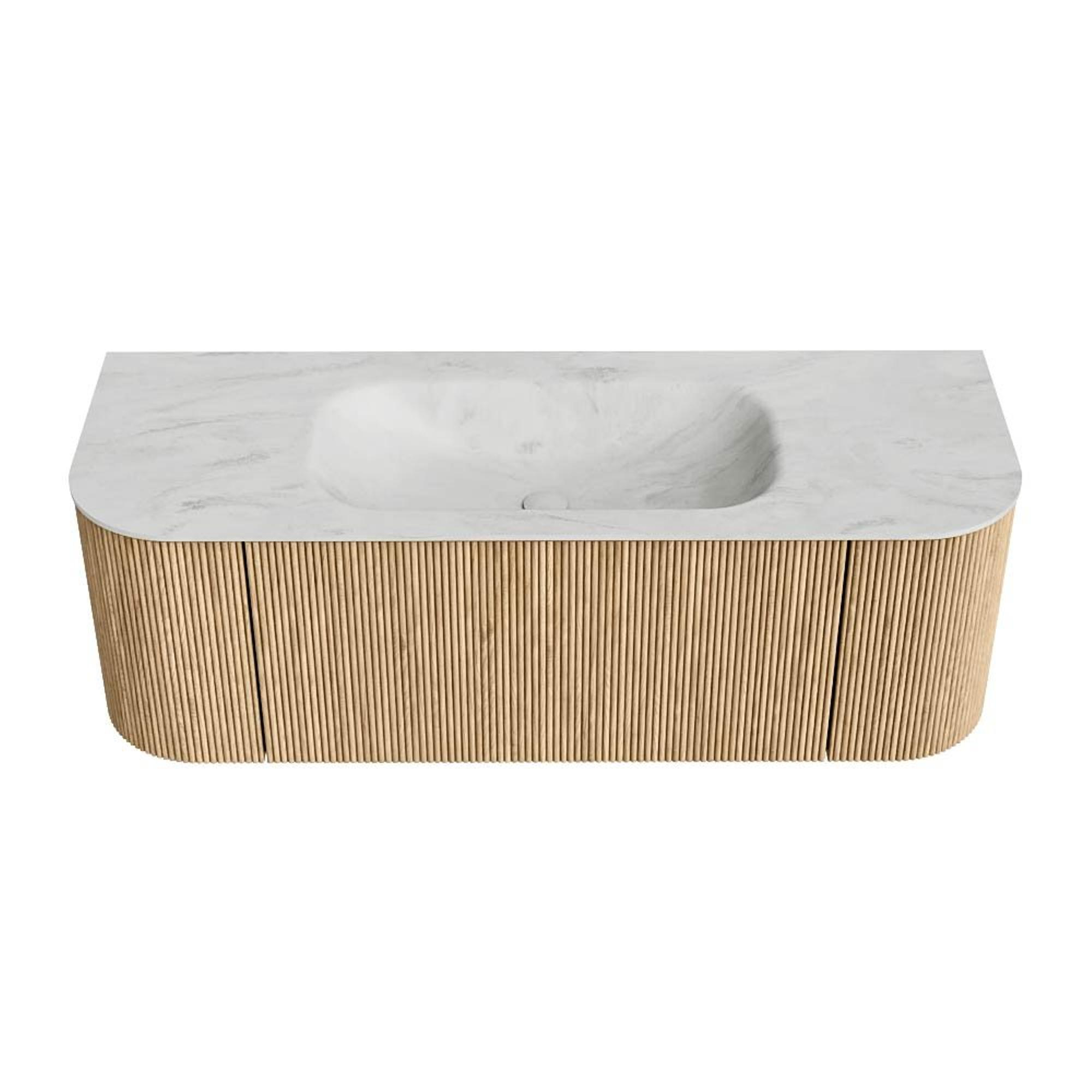 MONDIAZ KURVE-DLUX 130cm badmeubel met module 25 Len R kleur Oak met 1 lade en 2 deuren. Wastafel BIG SMALL midden 1 kraangat kleur Opalo.