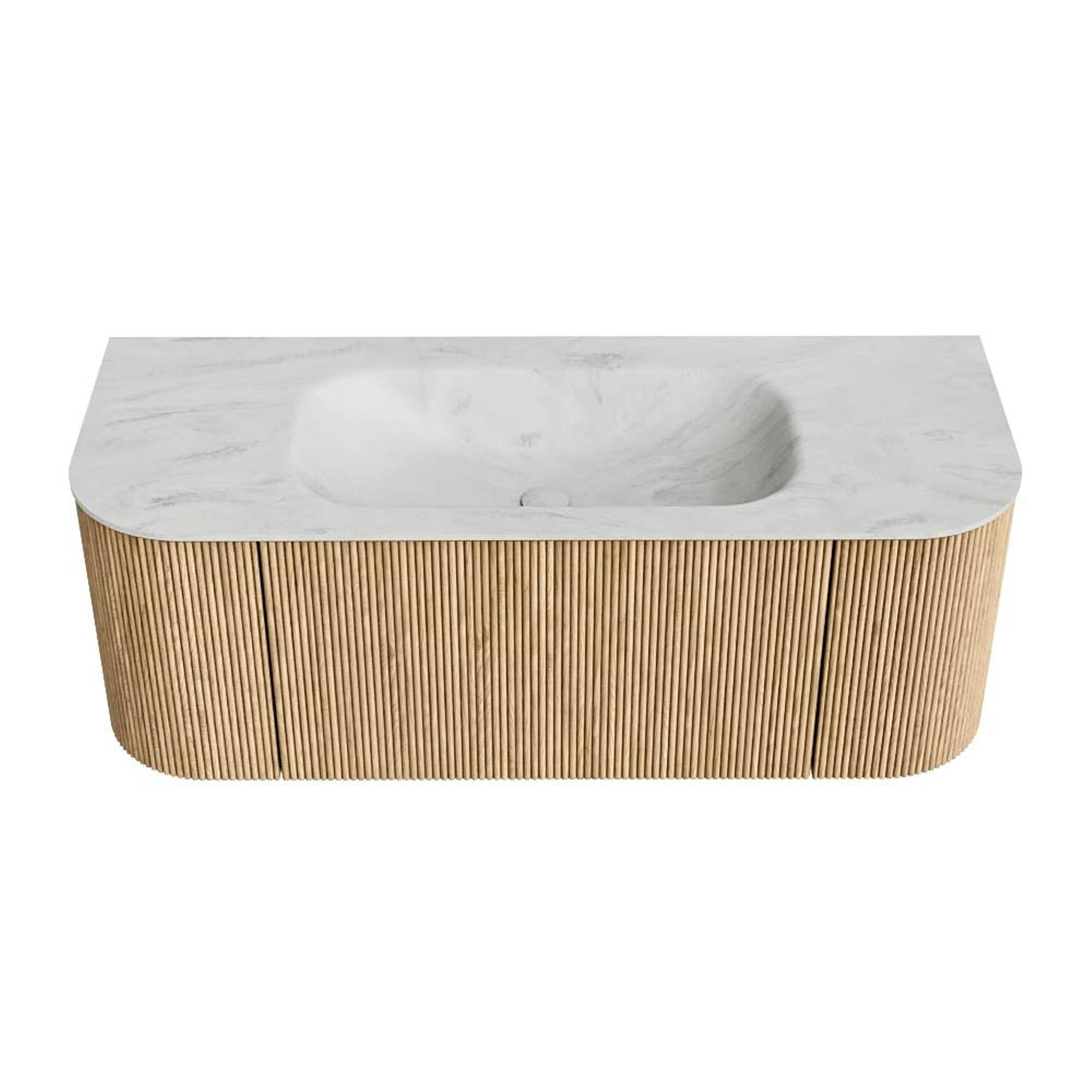 Het ultieme badmeubel dat je badkamer transformeert tot een oase van verfijning. Met zijn halfronde, verticale stroken van massief eiken, verkrijgbaar in de kleuren Oak en Walnut, straalt KURVE vakmanschap uit in elk detail. De zachte rondingen en slim ontworpen deurtjes, elk 40cm hoog, nodigen uit tot gebruik, terwijl de ruimte binnenin optimaal benut wordt dankzij de royale lade van dezelfde hoogte.