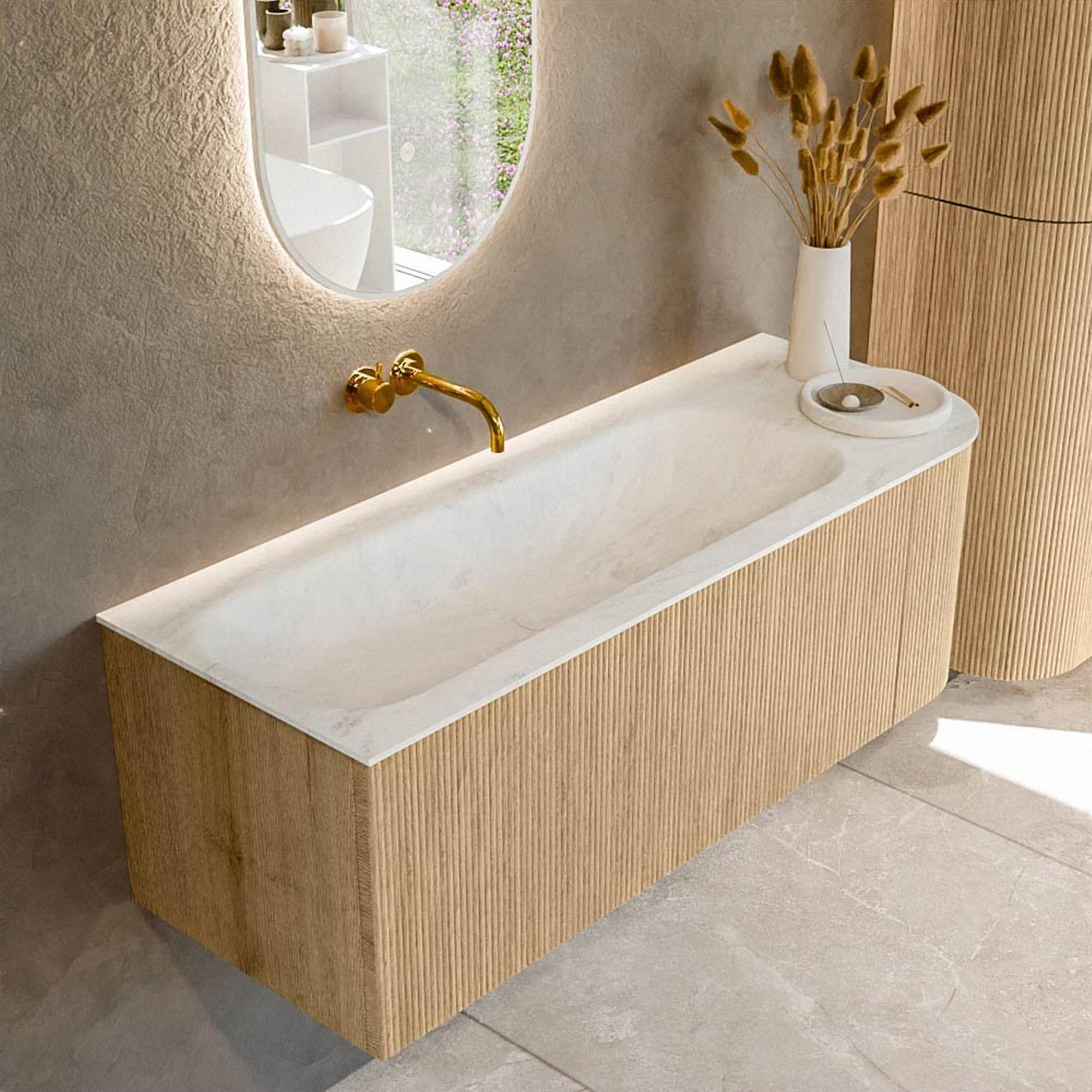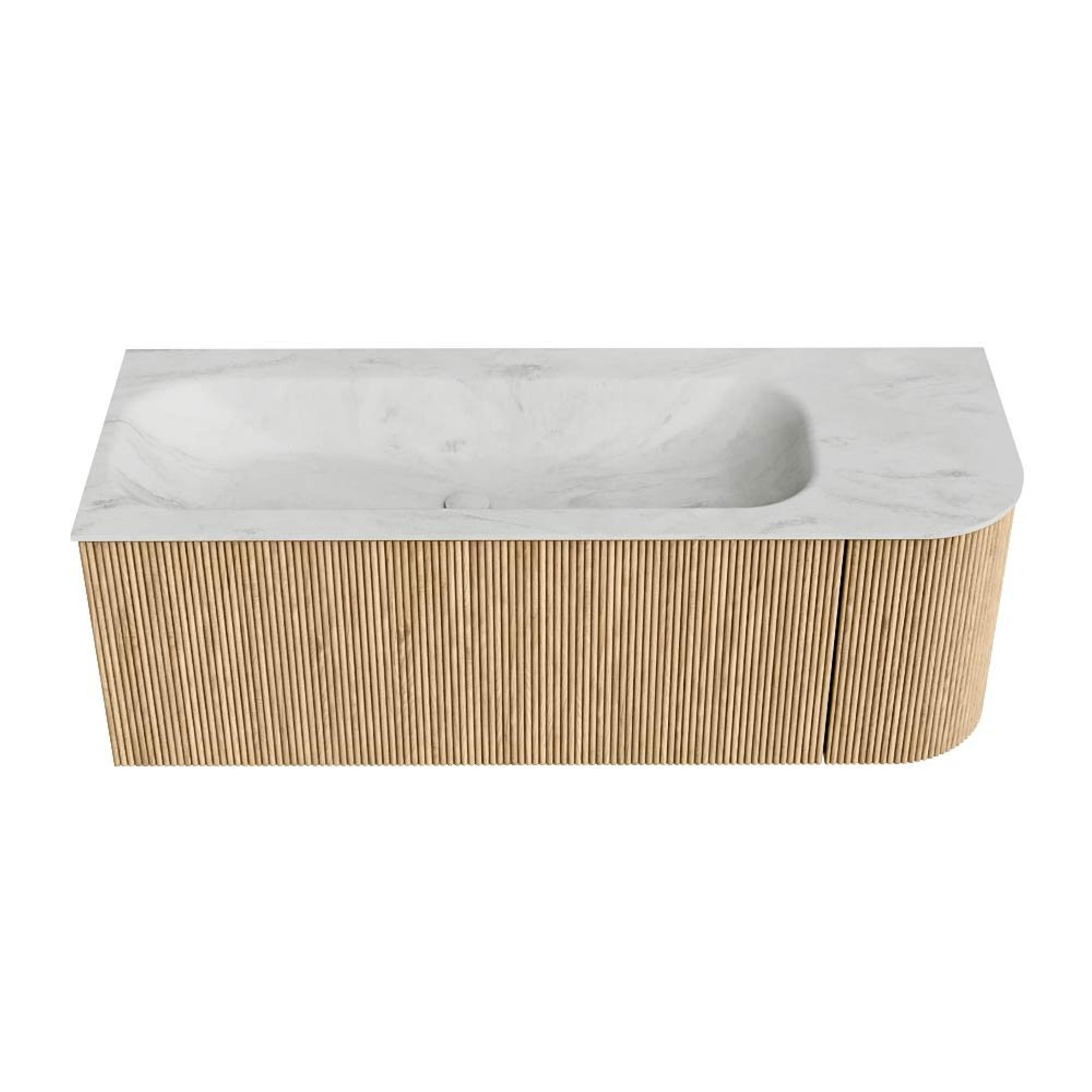 MONDIAZ KURVE-DLUX 125cm badmeubel met module 25 R kleur Oak met 1 lade en 1 deur. Wastafel BIG MEDIUM links zonder kraangat kleur Opalo.