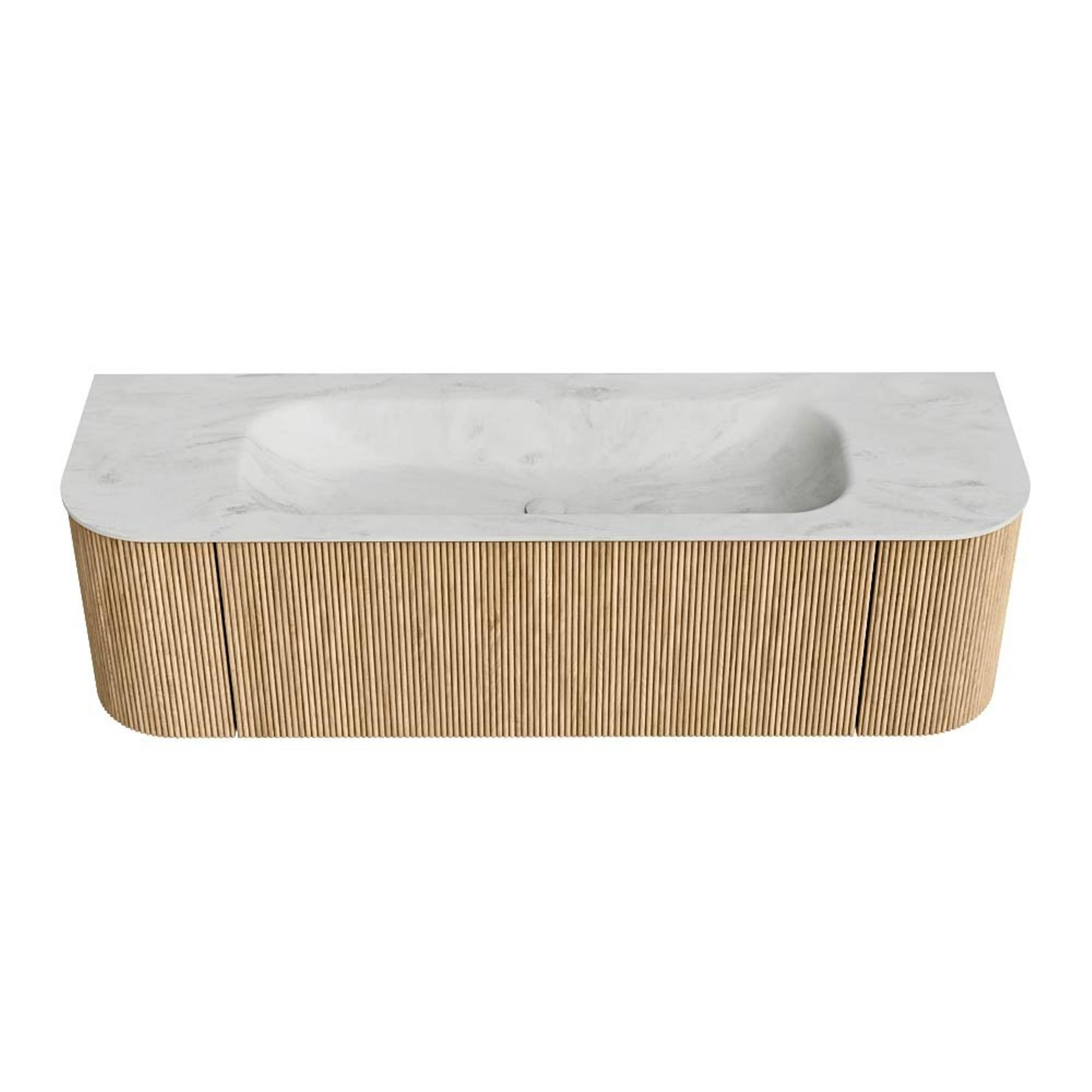 MONDIAZ KURVE-DLUX 150cm badmeubel met module 25 Len R kleur Oak met 1 lade en 2 deuren. Wastafel BIG MEDIUM midden 1 kraangat kleur Opalo.