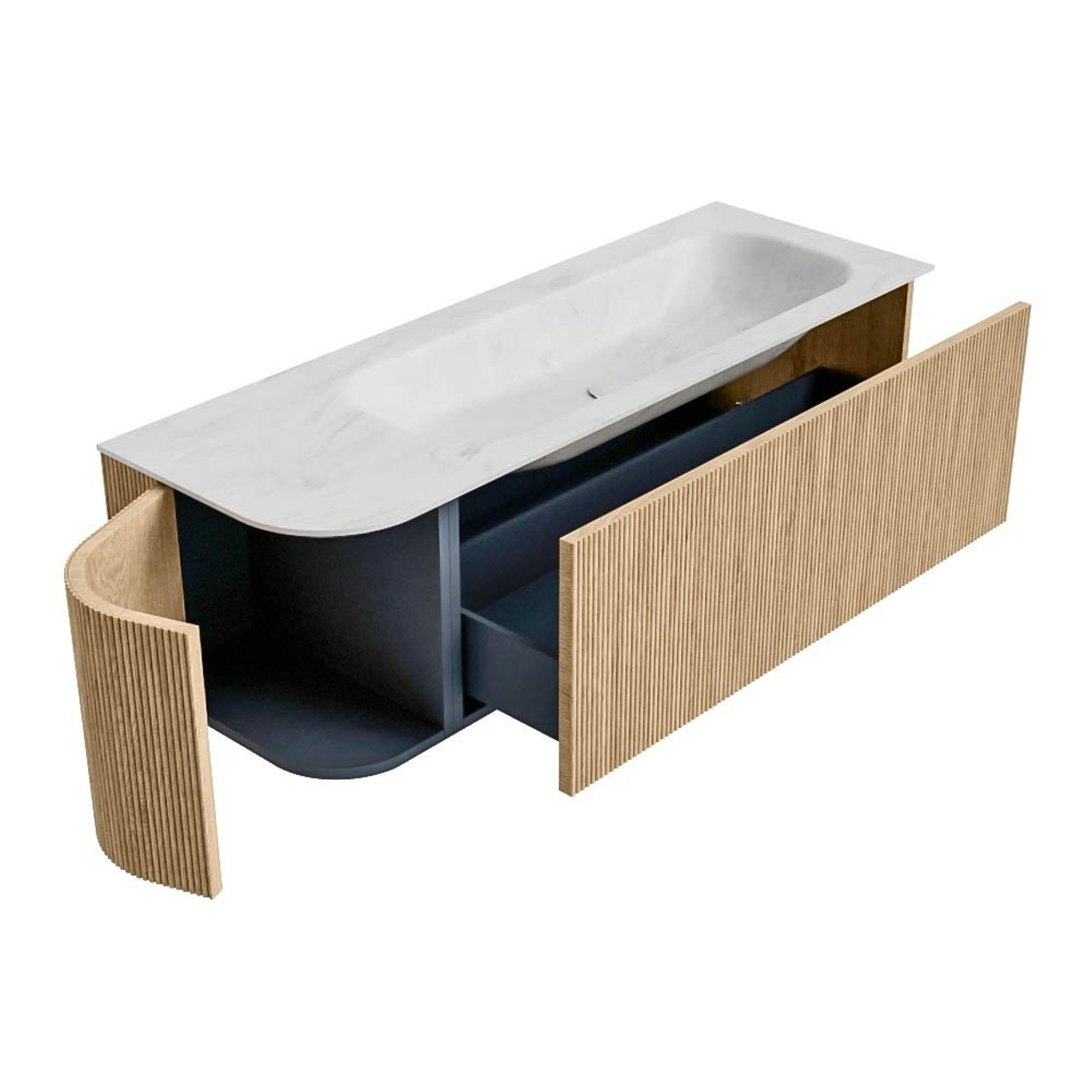 Het ultieme badmeubel dat je badkamer transformeert tot een oase van verfijning. Met zijn halfronde, verticale stroken van massief eiken, verkrijgbaar in de kleuren Oak en Walnut, straalt KURVE vakmanschap uit in elk detail. De zachte rondingen en slim ontworpen deurtjes, elk 40cm hoog, nodigen uit tot gebruik, terwijl de ruimte binnenin optimaal benut wordt dankzij de royale lade van dezelfde hoogte.