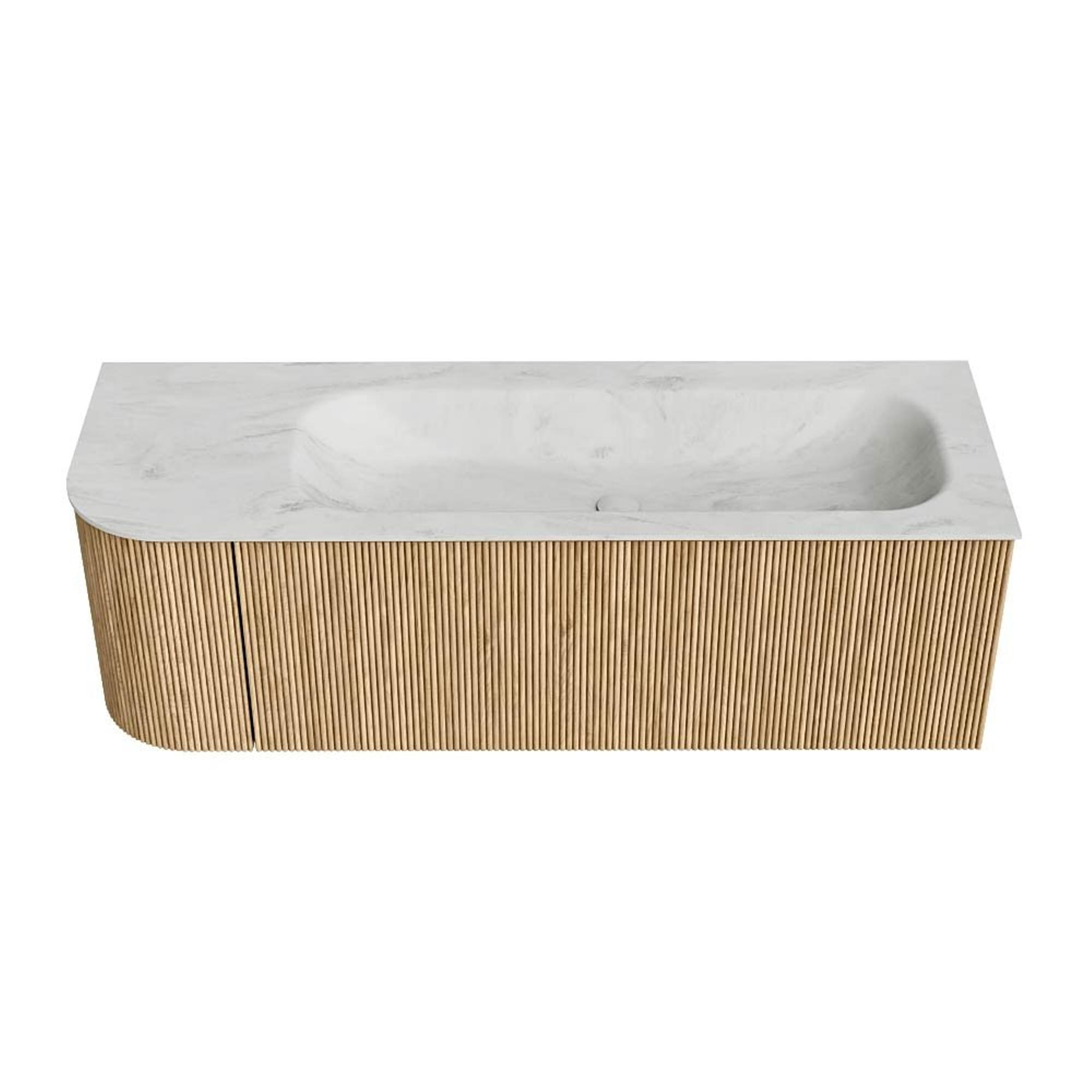 MONDIAZ KURVE-DLUX 135cm badmeubel met module 25 L kleur Oak met 1 lade en 1 deur. Wastafel BIG MEDIUM rechts zonder kraangat kleur Opalo.