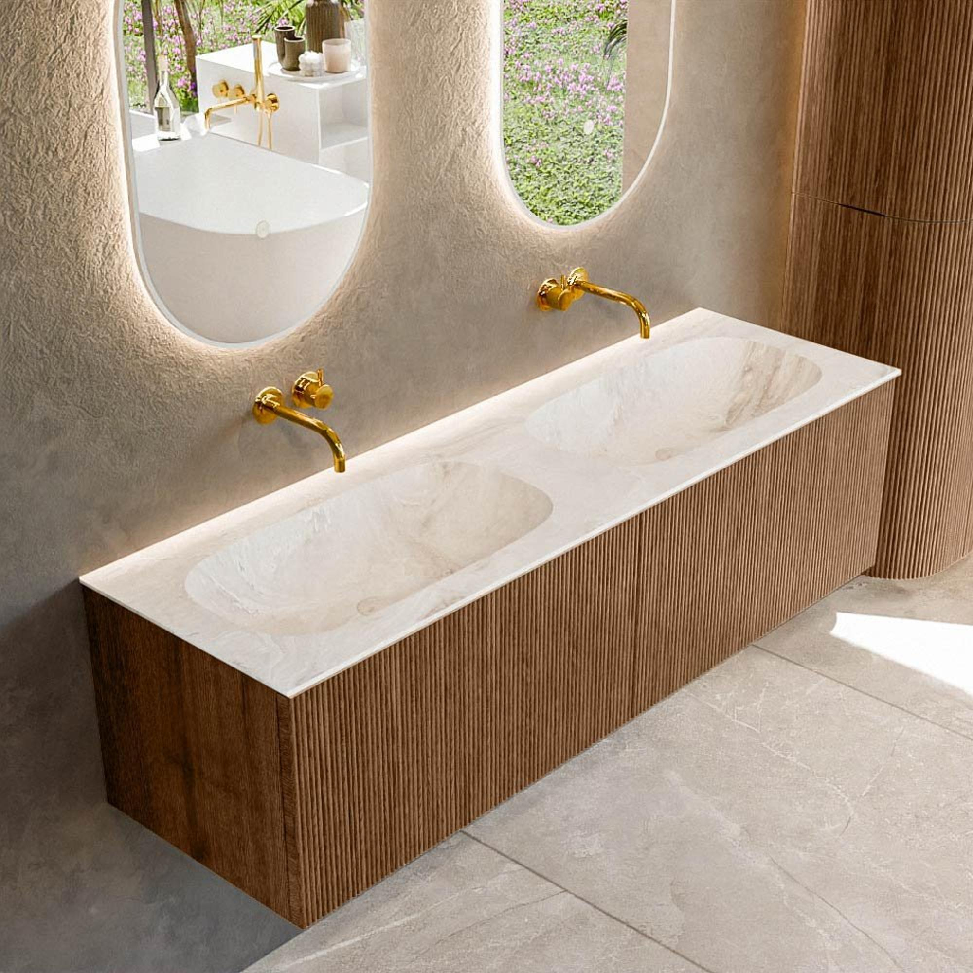 MONDIAZ KURVE-DLUX 150cm badmeubel kleur Walnut met 2 lades. Wastafel STOR SMALL dubbel zonder kraangat kleur Frappe.