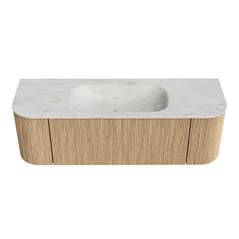 MONDIAZ KURVE-DLUX 140cm badmeubel met module 25 Len R kleur Oak met 1 lade en 2 deuren. Wastafel BIG SMALL midden zonder kraangat kleur Opalo.