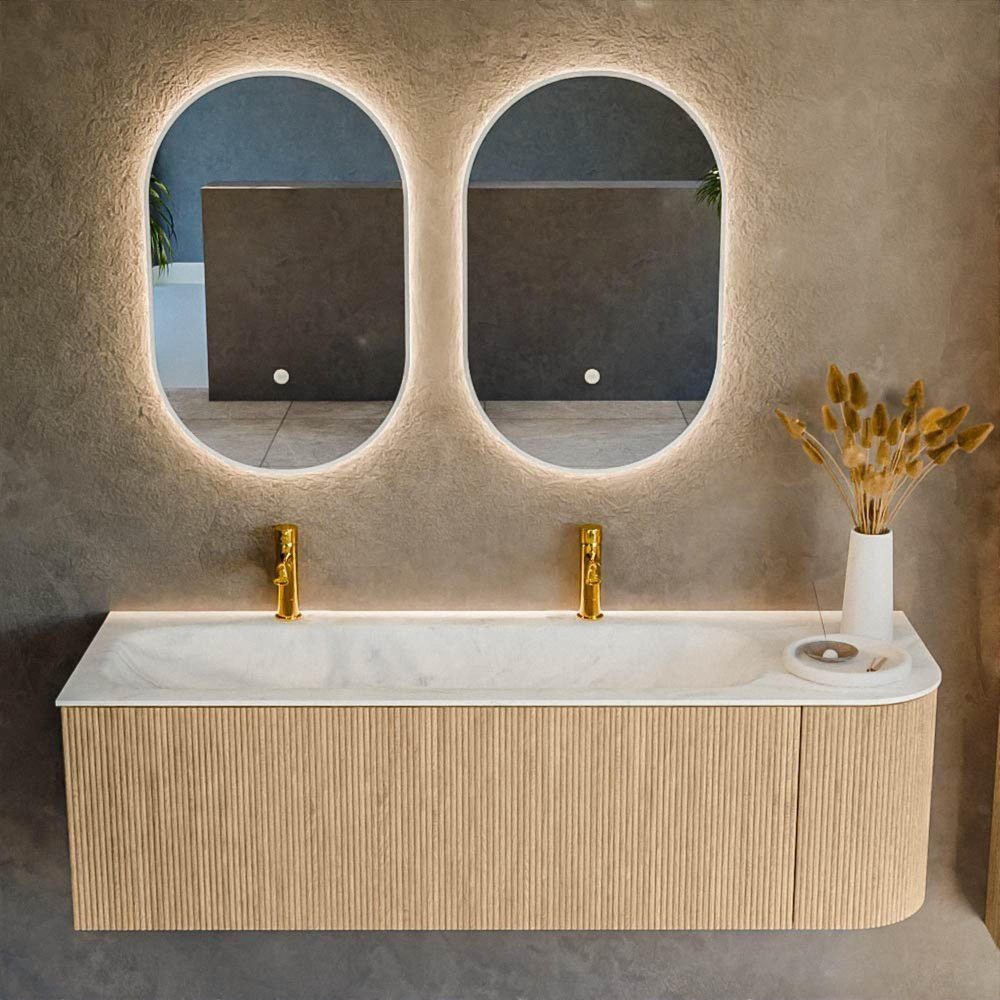 Het ultieme badmeubel dat je badkamer transformeert tot een oase van verfijning. Met zijn halfronde, verticale stroken van massief eiken, verkrijgbaar in de kleuren Oak en Walnut, straalt KURVE vakmanschap uit in elk detail. De zachte rondingen en slim ontworpen deurtjes, elk 40cm hoog, nodigen uit tot gebruik, terwijl de ruimte binnenin optimaal benut wordt dankzij de royale lade van dezelfde hoogte.