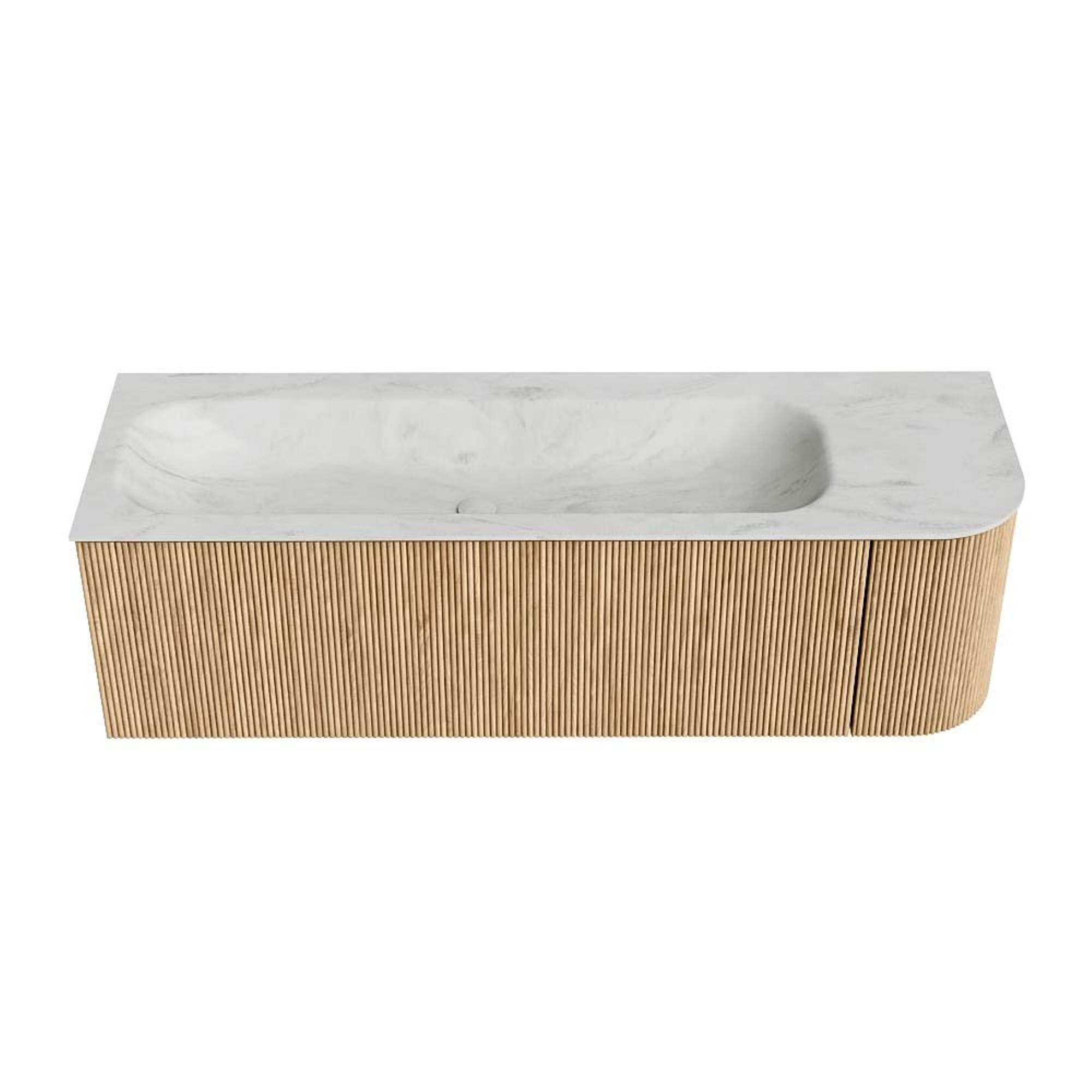 MONDIAZ KURVE-DLUX 145cm badmeubel met module 25 R kleur Oak met 1 lade en 1 deur. Wastafel BIG LARGE links 2 kraangaten kleur Opalo.