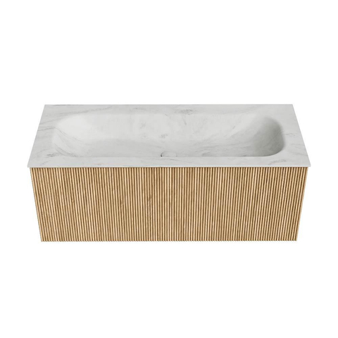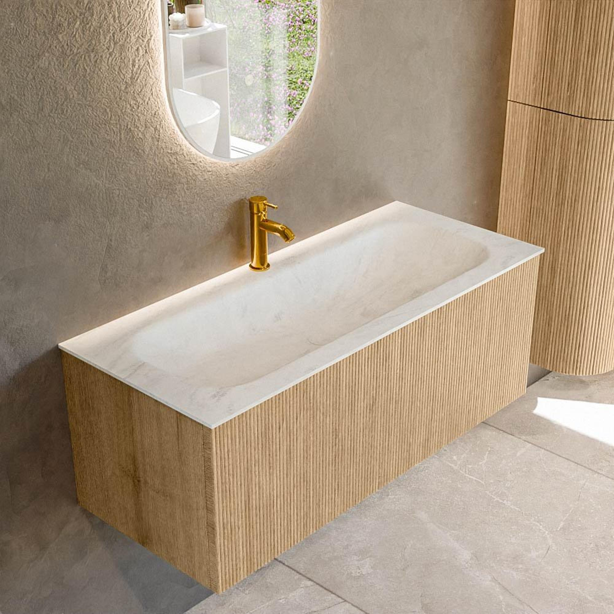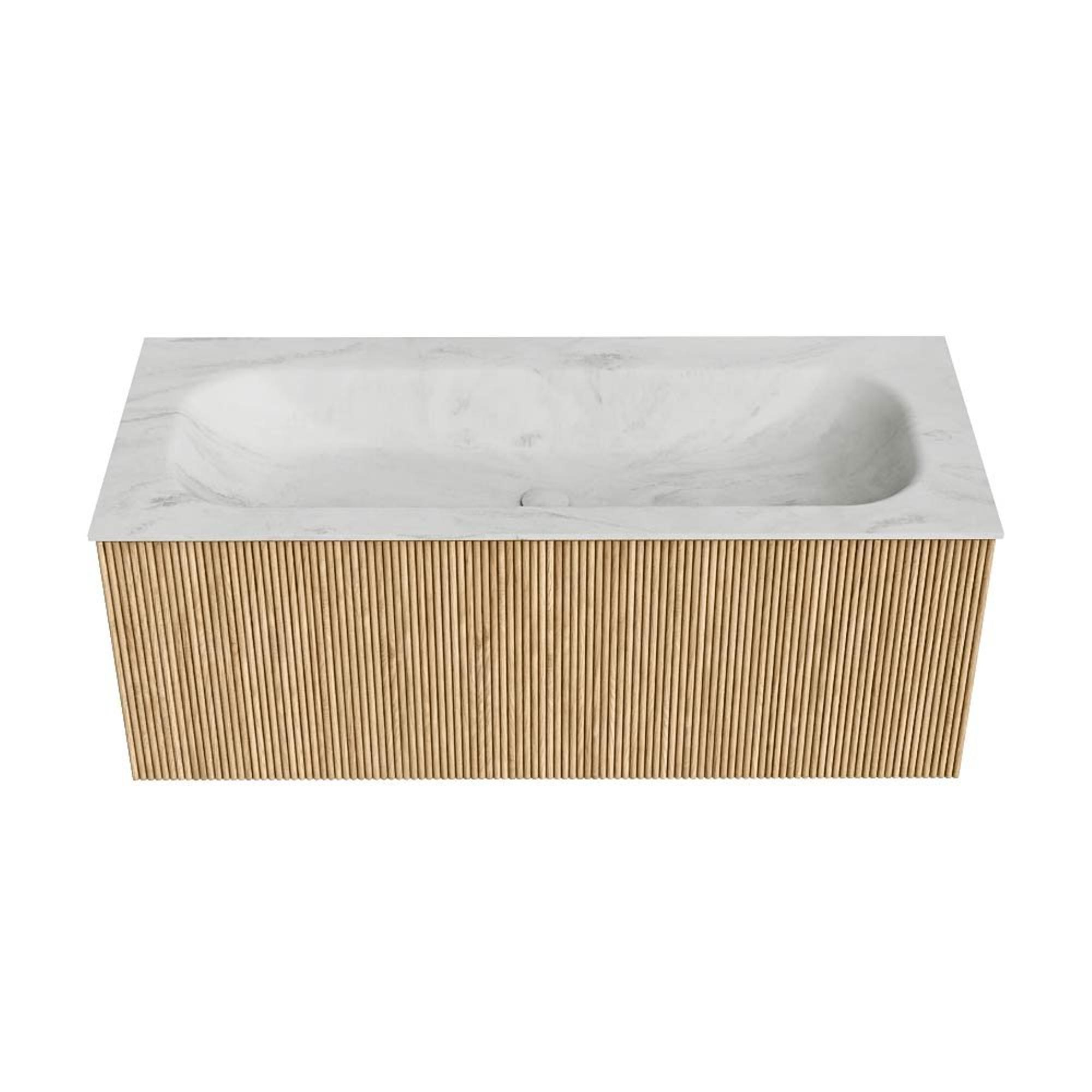 MONDIAZ KURVE-DLUX 110cm badmeubel kleur Oak met 1 lade. Wastafel BIG MEDIUM midden 1 kraangat kleur Opalo.
