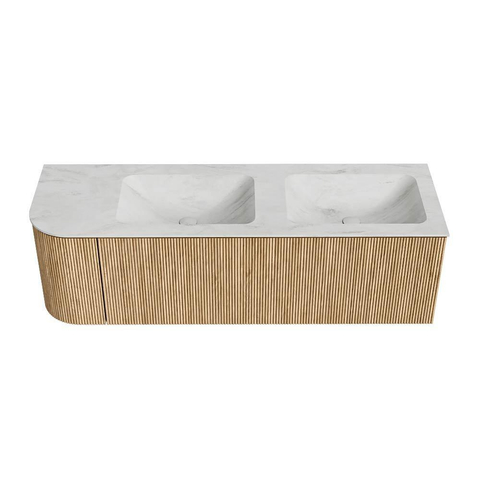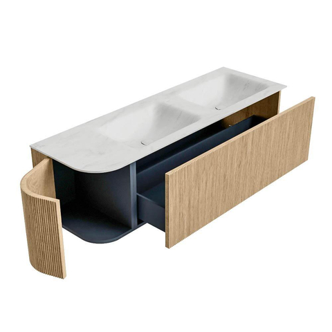 MONDIAZ KURVE-DLUX 145cm badmeubel met module 25 L kleur Oak met 1 lade en 1 deur. Wastafel LEAF dubbel / rechts zonder kraangat kleur Opalo.