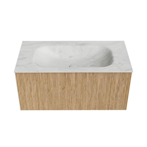 MONDIAZ KURVE-DLUX 90cm badmeubel kleur Oak met 1 lade. Wastafel BIG SMALL midden zonder kraangat kleur Opalo.
