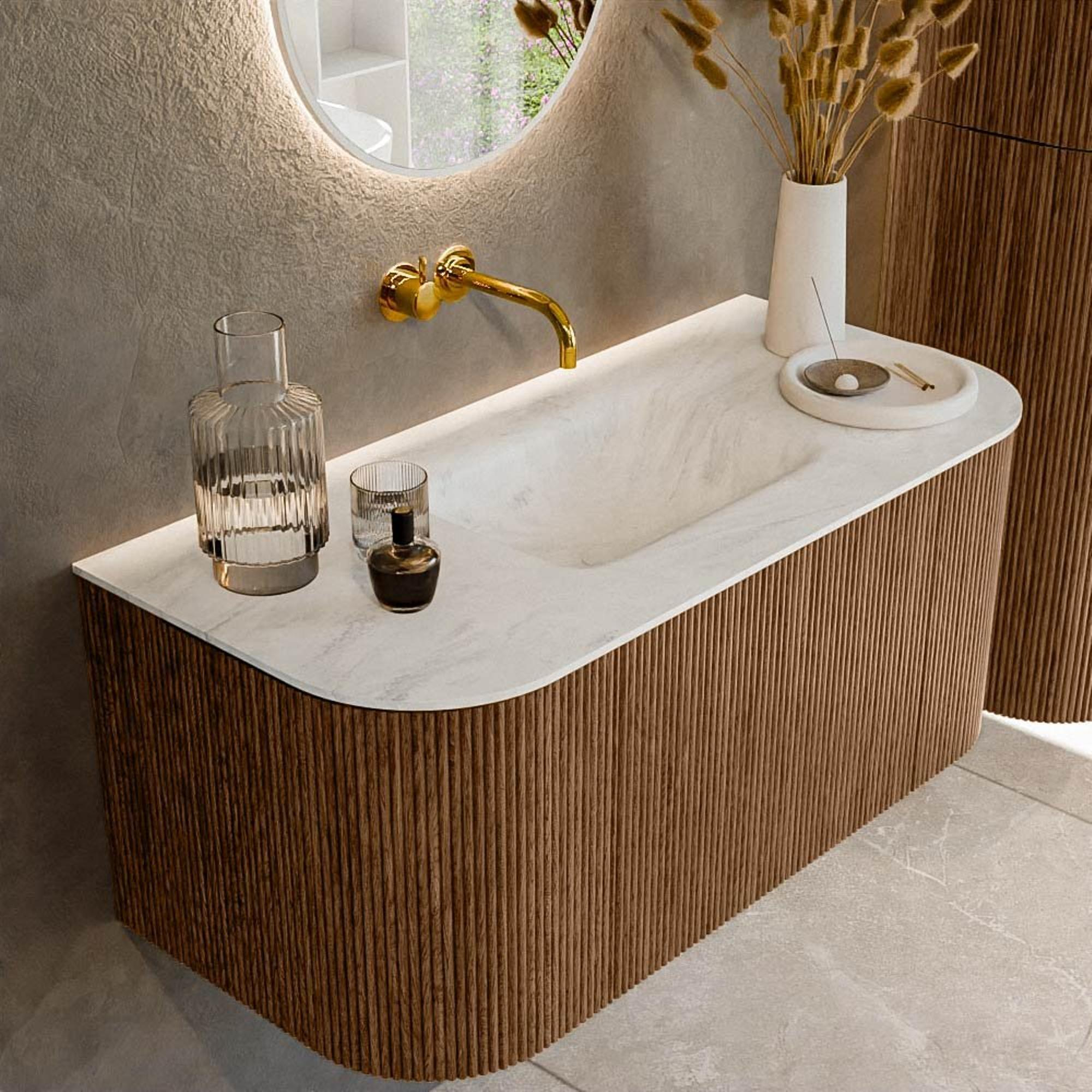 Het ultieme badmeubel dat je badkamer transformeert tot een oase van verfijning. Met zijn halfronde, verticale stroken van massief eiken, verkrijgbaar in de kleuren Oak en Walnut, straalt KURVE vakmanschap uit in elk detail. De zachte rondingen en slim ontworpen deurtjes, elk 40cm hoog, nodigen uit tot gebruik, terwijl de ruimte binnenin optimaal benut wordt dankzij de royale lade van dezelfde hoogte.