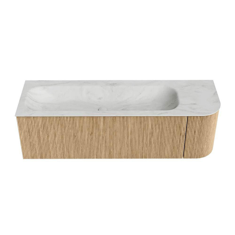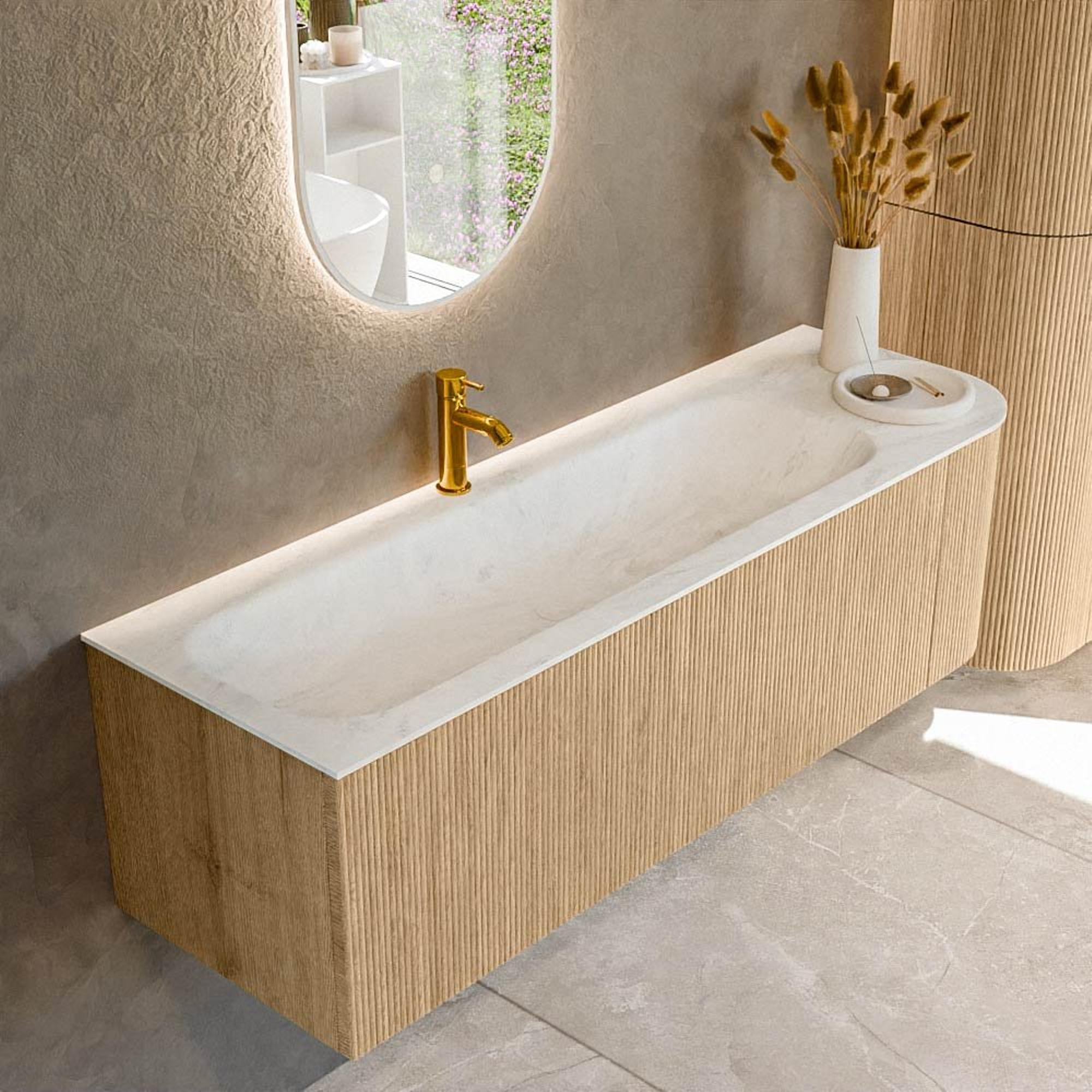 MONDIAZ KURVE-DLUX 145cm badmeubel met module 25 R kleur Oak met 1 lade en 1 deur. Wastafel BIG LARGE links 1 kraangat kleur Opalo.
