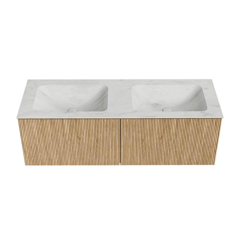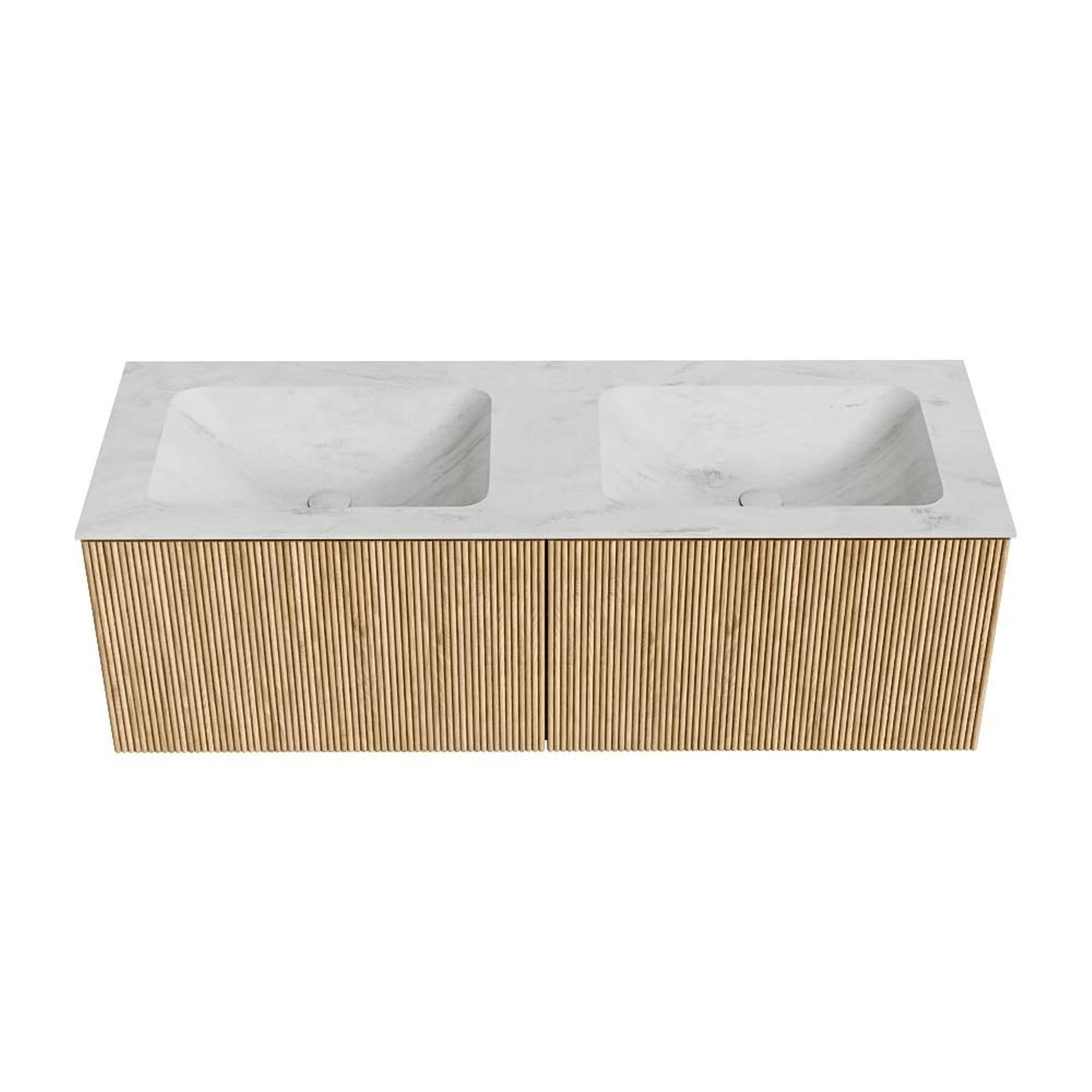 MONDIAZ KURVE-DLUX 130cm badmeubel kleur Oak met 2 lades. Wastafel LEAF dubbel zonder kraangat kleur Opalo.