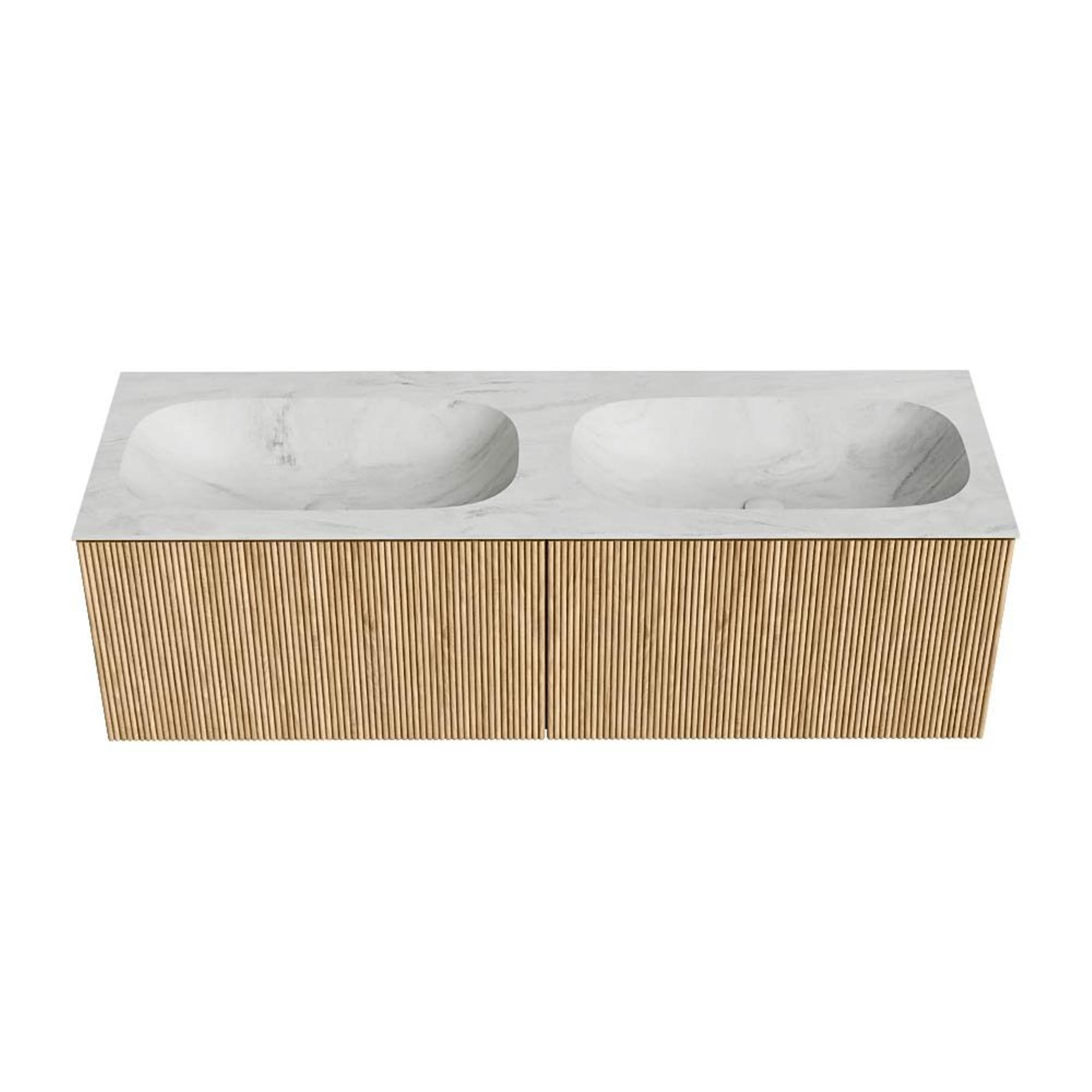 MONDIAZ KURVE-DLUX 140cm badmeubel kleur Oak met 2 lades. Wastafel STOR SMALL dubbel zonder kraangat kleur Opalo.