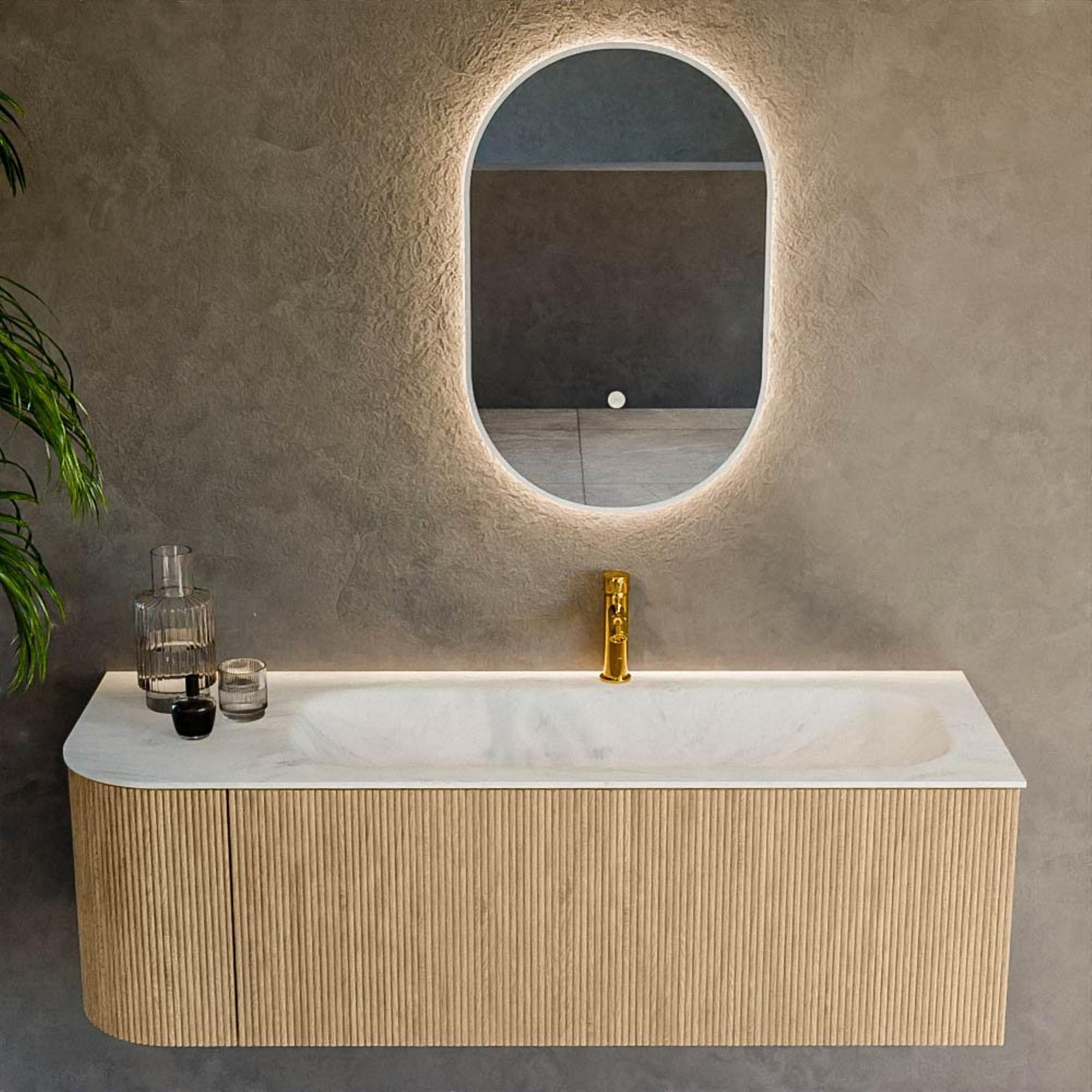 Het ultieme badmeubel dat je badkamer transformeert tot een oase van verfijning. Met zijn halfronde, verticale stroken van massief eiken, verkrijgbaar in de kleuren Oak en Walnut, straalt KURVE vakmanschap uit in elk detail. De zachte rondingen en slim ontworpen deurtjes, elk 40cm hoog, nodigen uit tot gebruik, terwijl de ruimte binnenin optimaal benut wordt dankzij de royale lade van dezelfde hoogte.