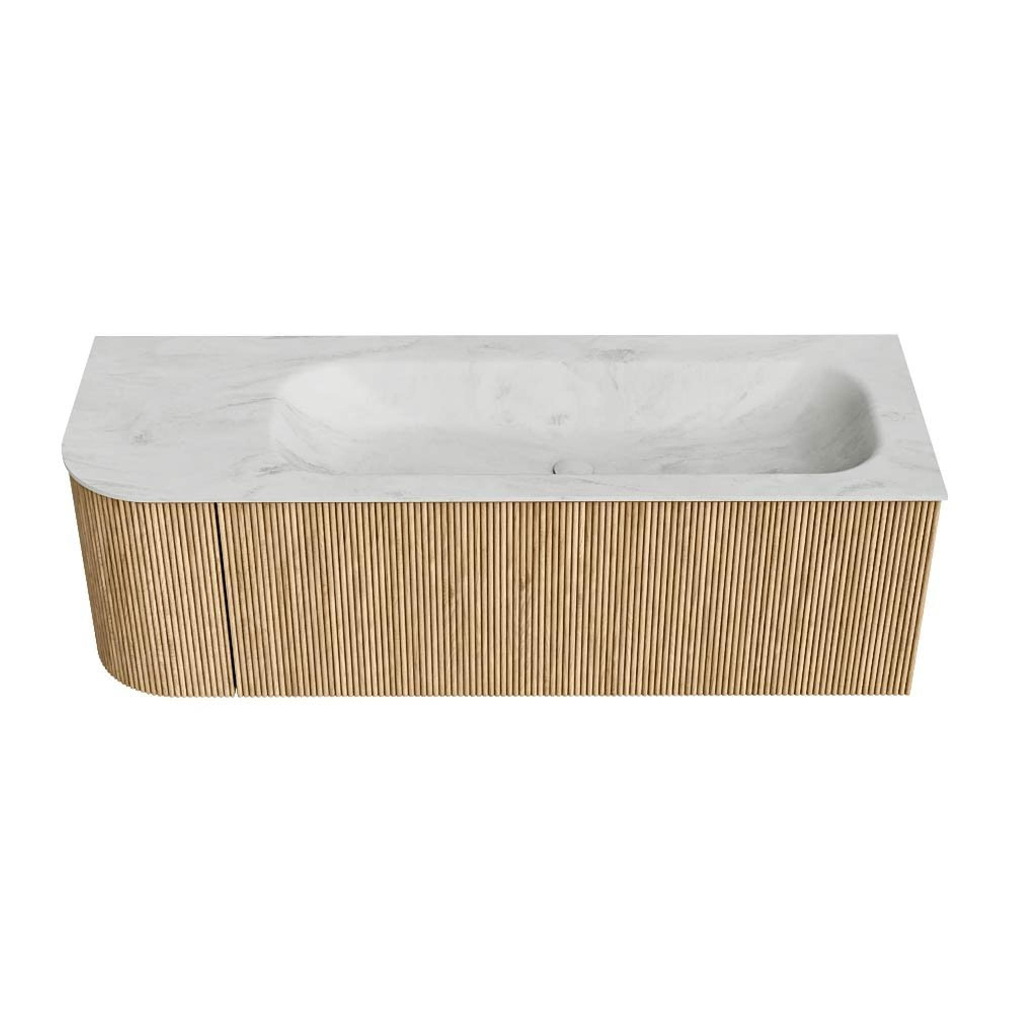 MONDIAZ KURVE-DLUX 135cm badmeubel met module 25 L kleur Oak met 1 lade en 1 deur. Wastafel BIG MEDIUM rechts 1 kraangat kleur Opalo.