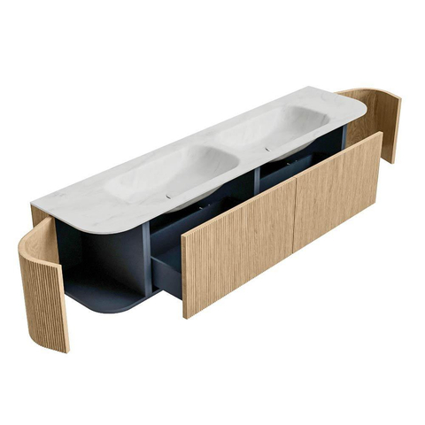 Het ultieme badmeubel dat je badkamer transformeert tot een oase van verfijning. Met zijn halfronde, verticale stroken van massief eiken, verkrijgbaar in de kleuren Oak en Walnut, straalt KURVE vakmanschap uit in elk detail. De zachte rondingen en slim ontworpen deurtjes, elk 40cm hoog, nodigen uit tot gebruik, terwijl de ruimte binnenin optimaal benut wordt dankzij de royale lade van dezelfde hoogte.