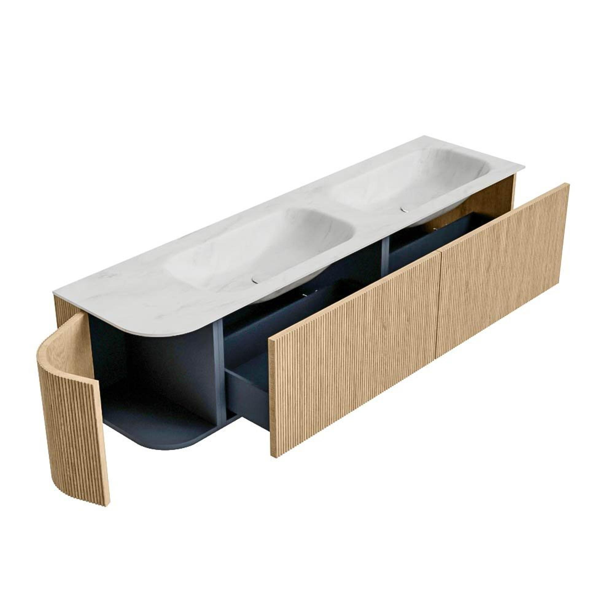 MONDIAZ KURVE-DLUX 175cm badmeubel met module 25 L kleur Oak met 2 lades en 1 deur. Wastafel STOR SMALL dubbel / rechts 2 kraangaten kleur Opalo.