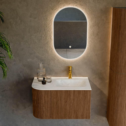 Het ultieme badmeubel dat je badkamer transformeert tot een oase van verfijning. Met zijn halfronde, verticale stroken van massief eiken, verkrijgbaar in de kleuren Oak en Walnut, straalt KURVE vakmanschap uit in elk detail. De zachte rondingen en slim ontworpen deurtjes, elk 40cm hoog, nodigen uit tot gebruik, terwijl de ruimte binnenin optimaal benut wordt dankzij de royale lade van dezelfde hoogte.
