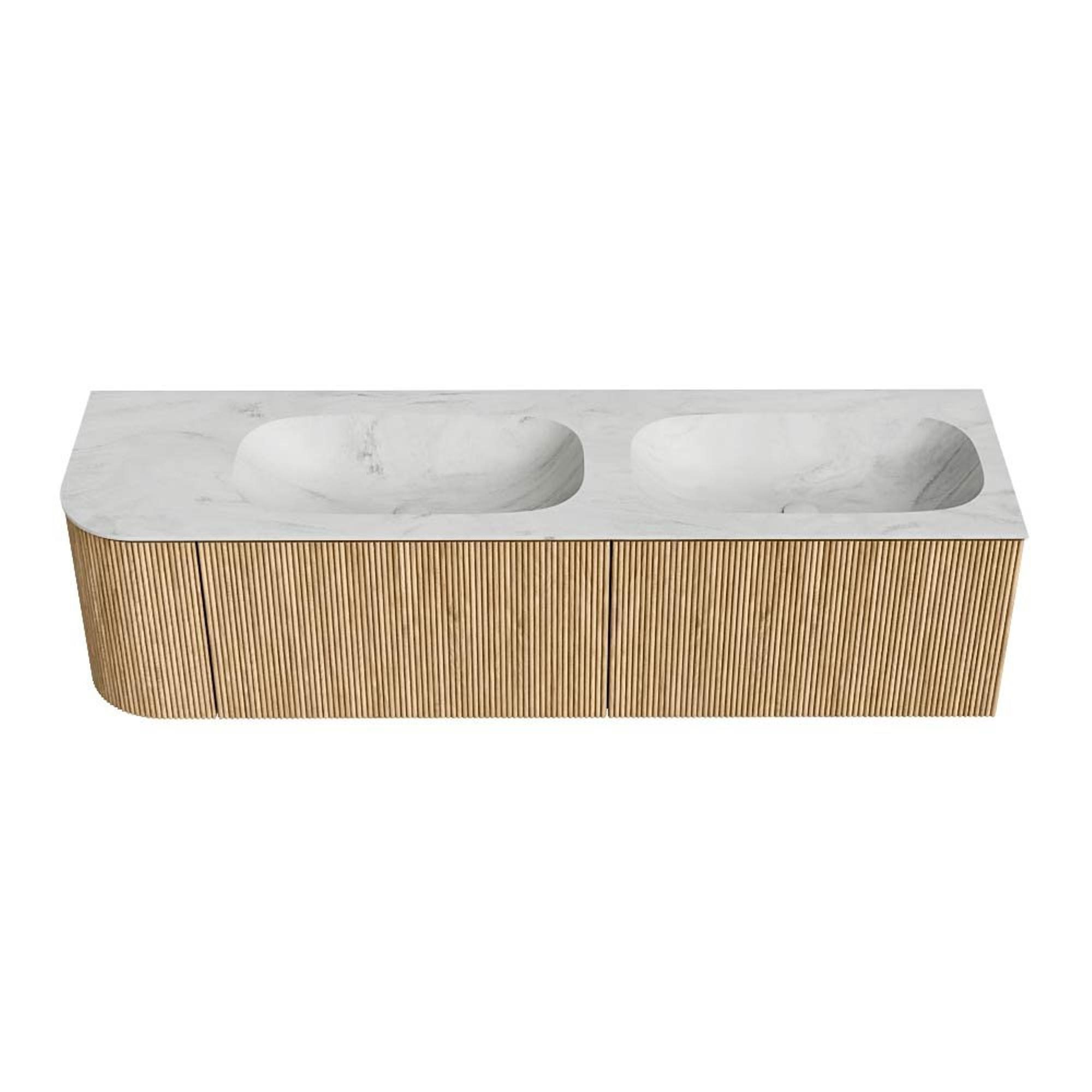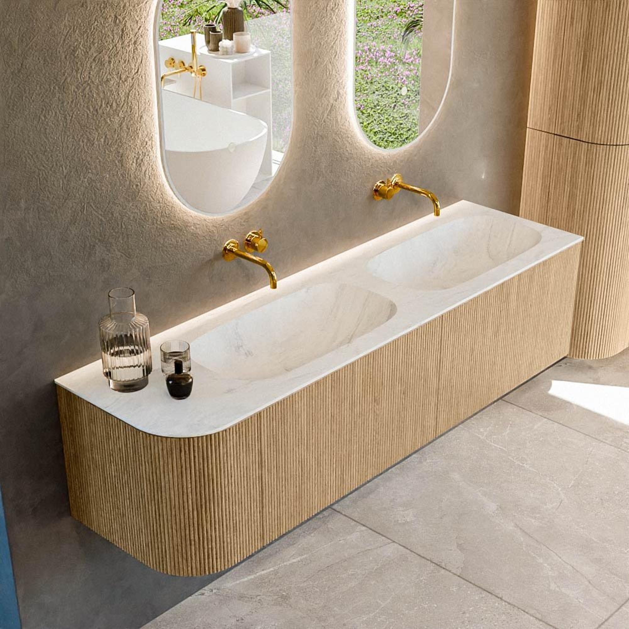 Het ultieme badmeubel dat je badkamer transformeert tot een oase van verfijning. Met zijn halfronde, verticale stroken van massief eiken, verkrijgbaar in de kleuren Oak en Walnut, straalt KURVE vakmanschap uit in elk detail. De zachte rondingen en slim ontworpen deurtjes, elk 40cm hoog, nodigen uit tot gebruik, terwijl de ruimte binnenin optimaal benut wordt dankzij de royale lade van dezelfde hoogte.