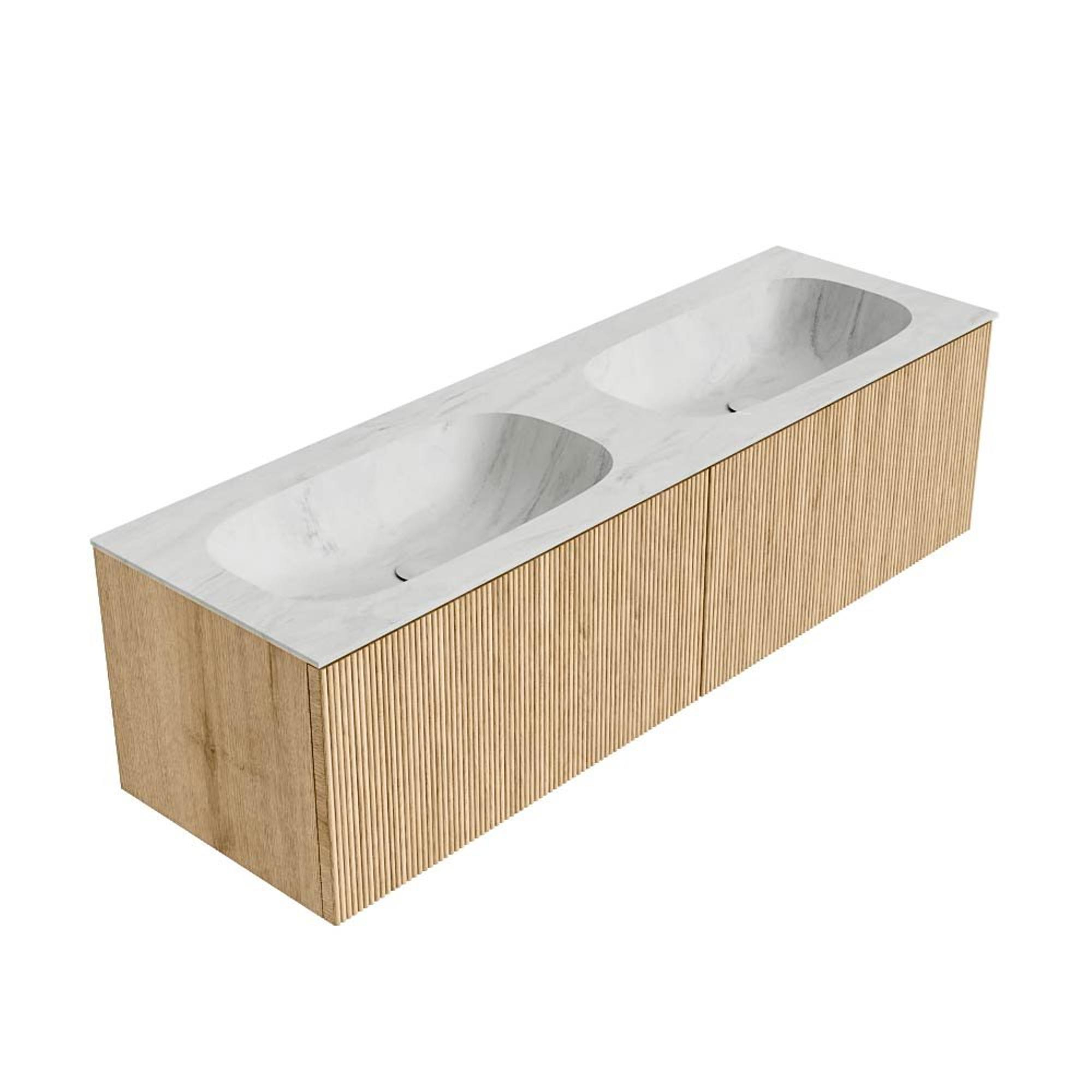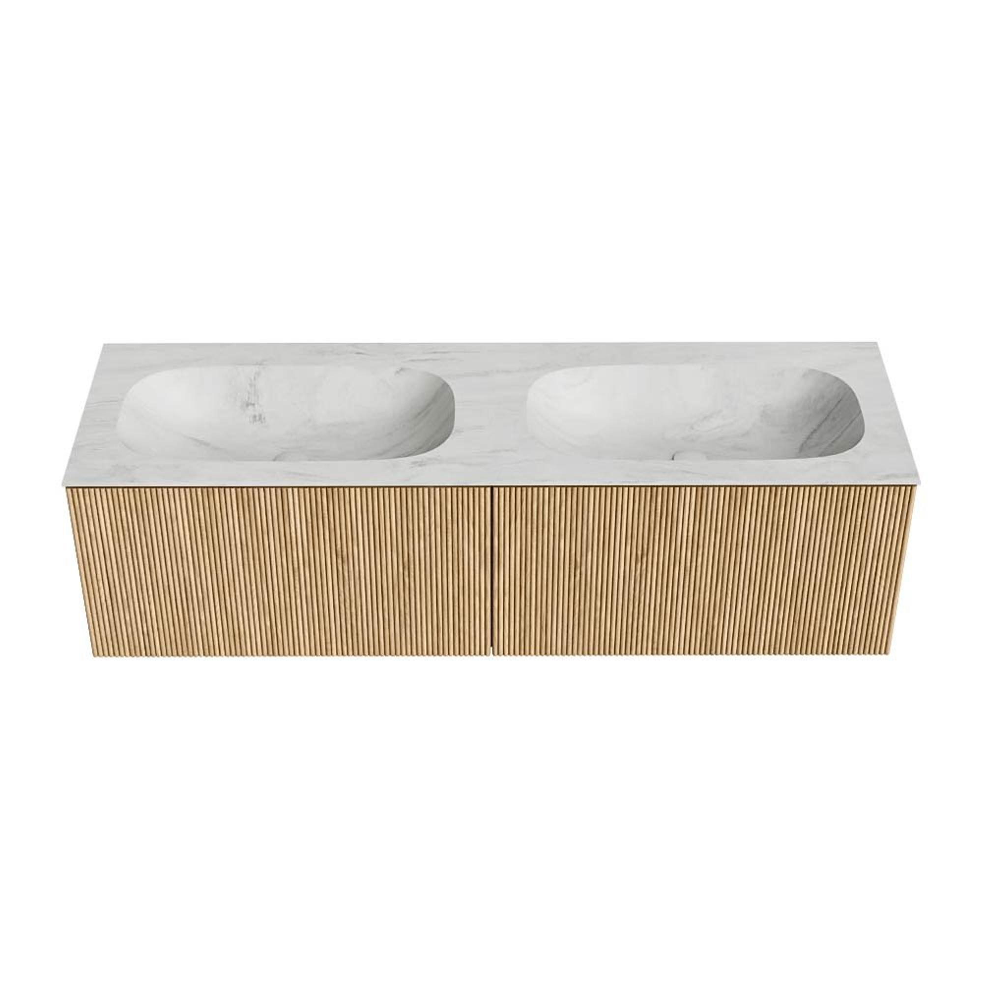 MONDIAZ KURVE-DLUX 150cm badmeubel kleur Oak met 2 lades. Wastafel STOR SMALL dubbel 2 kraangaten kleur Opalo.