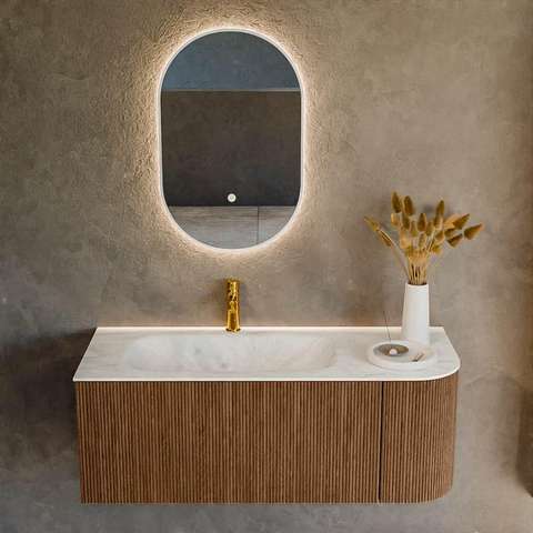 Het ultieme badmeubel dat je badkamer transformeert tot een oase van verfijning. Met zijn halfronde, verticale stroken van massief eiken, verkrijgbaar in de kleuren Oak en Walnut, straalt KURVE vakmanschap uit in elk detail. De zachte rondingen en slim ontworpen deurtjes, elk 40cm hoog, nodigen uit tot gebruik, terwijl de ruimte binnenin optimaal benut wordt dankzij de royale lade van dezelfde hoogte.