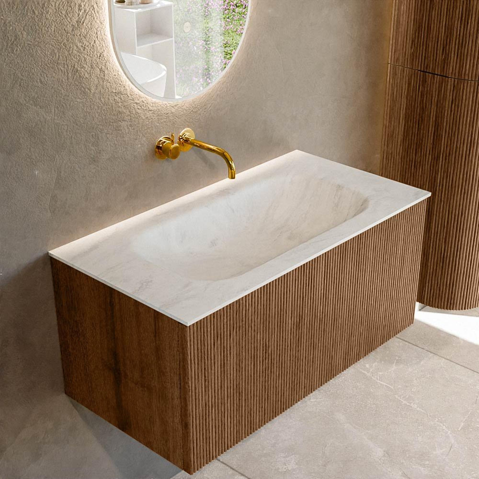 Het ultieme badmeubel dat je badkamer transformeert tot een oase van verfijning. Met zijn halfronde, verticale stroken van massief eiken, verkrijgbaar in de kleuren Oak en Walnut, straalt KURVE vakmanschap uit in elk detail. De zachte rondingen en slim ontworpen deurtjes, elk 40cm hoog, nodigen uit tot gebruik, terwijl de ruimte binnenin optimaal benut wordt dankzij de royale lade van dezelfde hoogte.