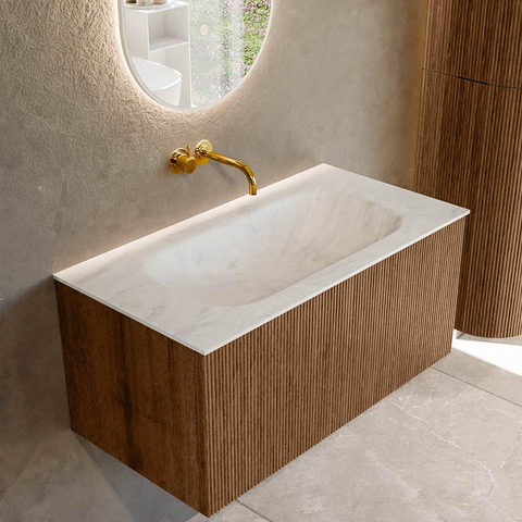 MONDIAZ KURVE-DLUX 90cm badmeubel kleur Walnut met 1 lade. Wastafel BIG SMALL midden zonder kraangat kleur Opalo.